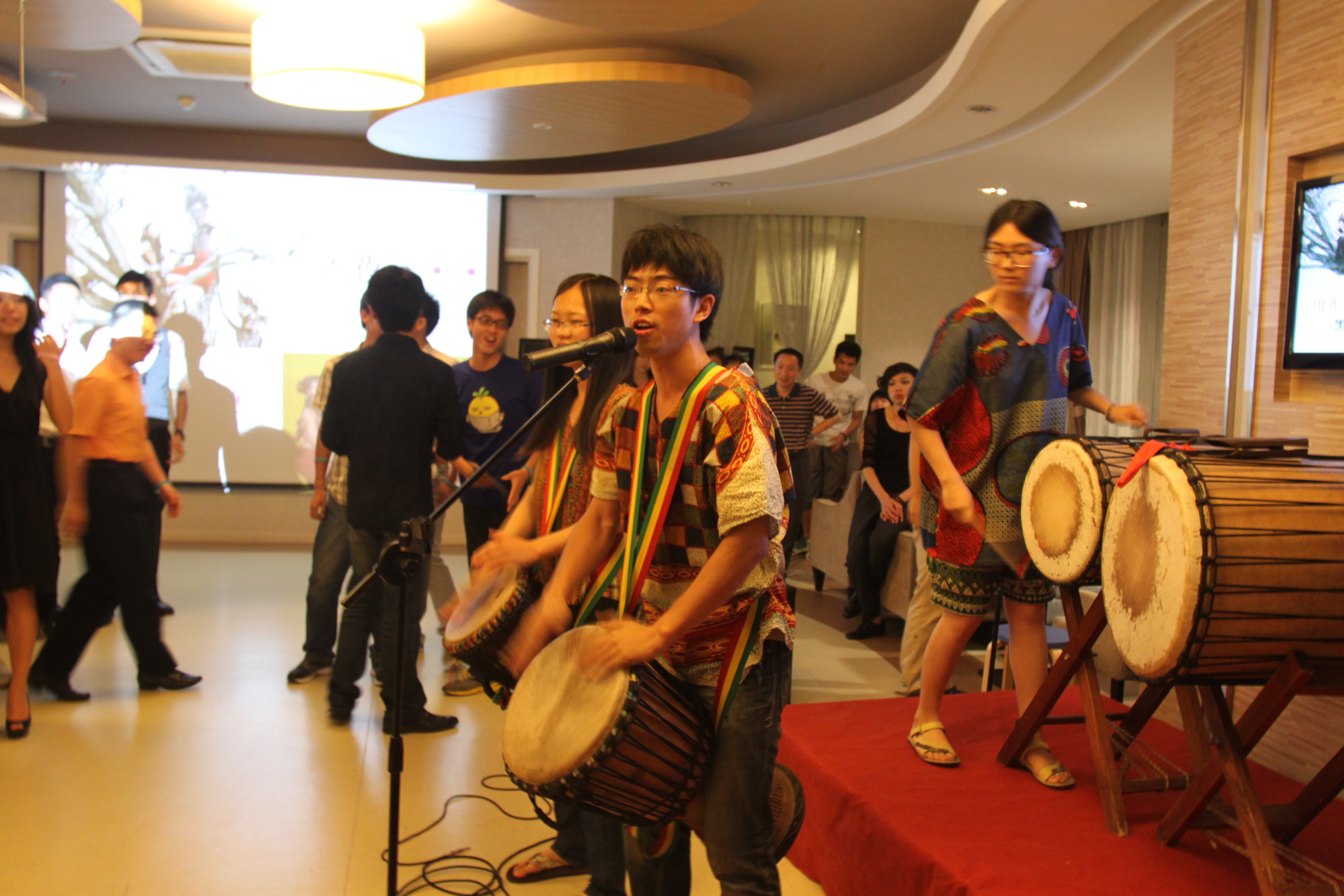 派对共分6个环节,每个环节都被赋予了不同的主题。“入夜,用光明祭奠黑暗”的分主题序幕被热情洋溢的非洲鼓表演拉开拉开,节奏明快的鼓声带动全场同学们摇摆起舞,场内的火热气氛也慢慢被点燃。来自浙江大学非洲鼓社团的同学们身着带有浓郁阿非利加风情的服饰在舞台中间卖力表演,演毕鼓手们还带动台下的观众们一起,拿着小鼓有节奏地拍打,很好地进行了互动。在接下来的一个环节,来自人文学院汉语言文学专业的陈青晔,以夸张的Boy Gaga造型点亮了“舞夜星空”。极具特色的个人表演让在场的来宾们笑声不断,掌声不断。为了进一步让来宾们活跃热络起来,陈青晔利用和来宾们互动的段子,带领大家舞动起来,在节奏强烈的舞曲节奏中,来宾们渐渐集中到舞池中间,大胆地起舞,一时间派对达到了高潮。在尽情的舞动之后,来自“暗夜天使”——校园歌手陈佳莹、巫金等同学的歌曲演唱,则将派对带入舒缓的毕业情绪之中,在场的来宾们也在缓缓的旋律中一一回忆着自己的大学生活。在此之后,特意设置的游戏环节再次将派对的气氛推上高潮。猜电影、记歌词和知识问答以及之后的奖惩环节让大家忍俊不禁。还没等大家的笑声渐息,“暗夜乐队”便隆重登场,充满力度的节奏让来宾们再次聚集到舞池中随着节奏摇摆……为了满足来宾中为数不少的球迷的需要,派对主办方特别安排了欧洲杯小组赛直播,精彩跌宕的足球之旅让派对现场多了一分激情与期待。