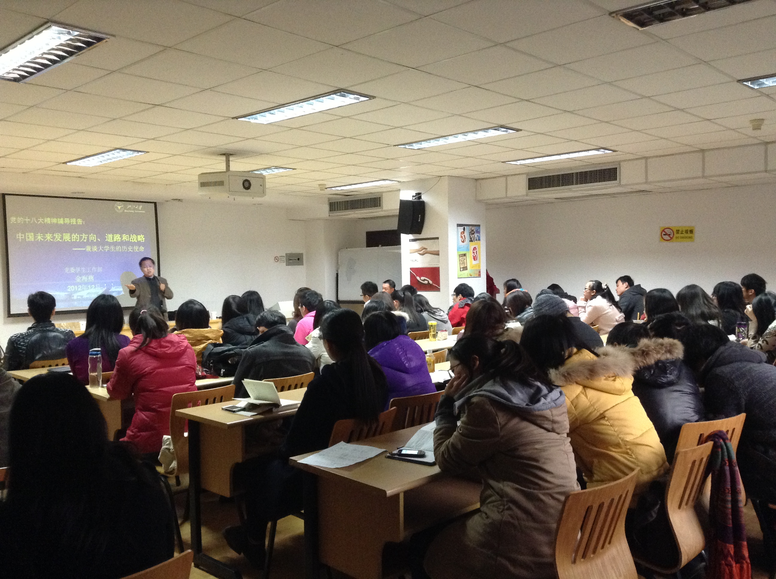 金部长从“世情”、“国情”、“党情”出发谈十八大的召开背景,认为在“后金融危机时期”的世情下、“社会主义初级阶段”的国情下、“执政环境发生变化,新生力量不断融入”的党情下,十八大的召开受到国内外的高度瞩目。金部长结合自身经验,从甘肃的地域划分、农村选举现状等入手,娓娓道来,积极互动,认为目前的道路还是比较适合中国社会的。他将中国腐败问题放到世界角度来比较,引用众多数据,提醒党员要保持与群众的鱼水关系,警惕蛙水关系、油水关系、水火关系。金部长认为想要在中国干大事,一定要对中国国情有深入且全面的了解,因此他鼓励学生党员了解社会,深入社会。