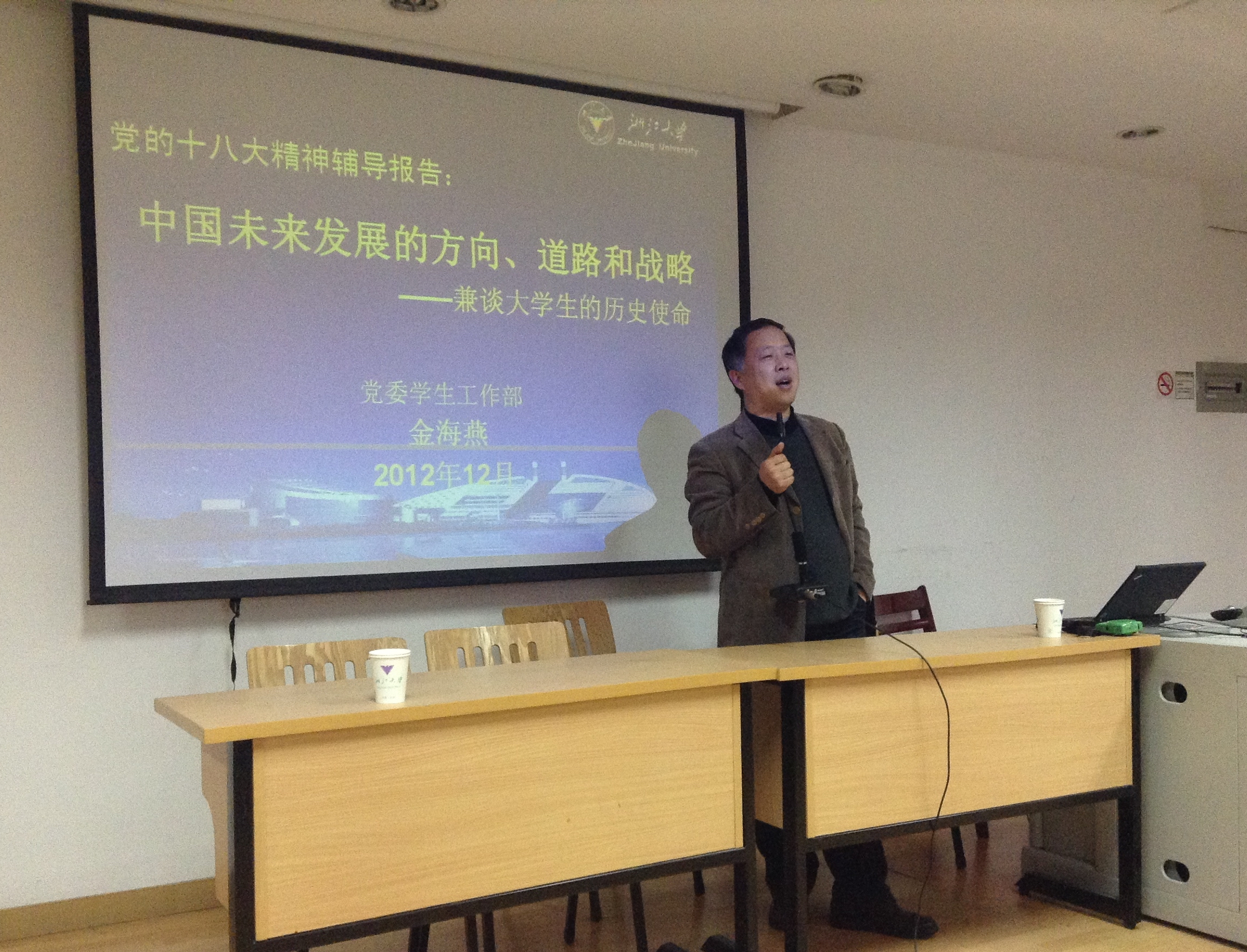 金海燕部长从“十八大的时代背景和历史方位”、“十八大的主题”、“中国特色社会主义总体布局”、“全面提高党的建设科学化水平”四个方面对十八大进行解读。金部长从具体生活出发,他认为,中国这么大,应该从“走什么体制、什么体制可以维护稳定”这样的思考下理解十八大。