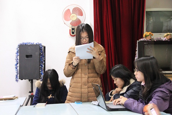 在三位预备党员念完自己的入党志愿书后,与会的同学开始对他们进行评价。熟悉潘玮的方艾青说,“潘玮很喜欢笑,人很开朗,很好相处,总之就很好嘛。”在孔南平眼中,吕文嘉是个学习很勤奋的学生,老师都经常夸她上课积极。而在其他同学眼中,孔南平是比吕文嘉还勤奋的学霸。“孔南平这个人是学霸,《网络传播》的期末论文要求写四千字,他交一万八。至于缺点嘛,就是你批评他,他说你黑他,你表扬他,他说你高级黑他。”兰发添大声说着他对孔南平的评价。话音刚落,其他人接着补充: