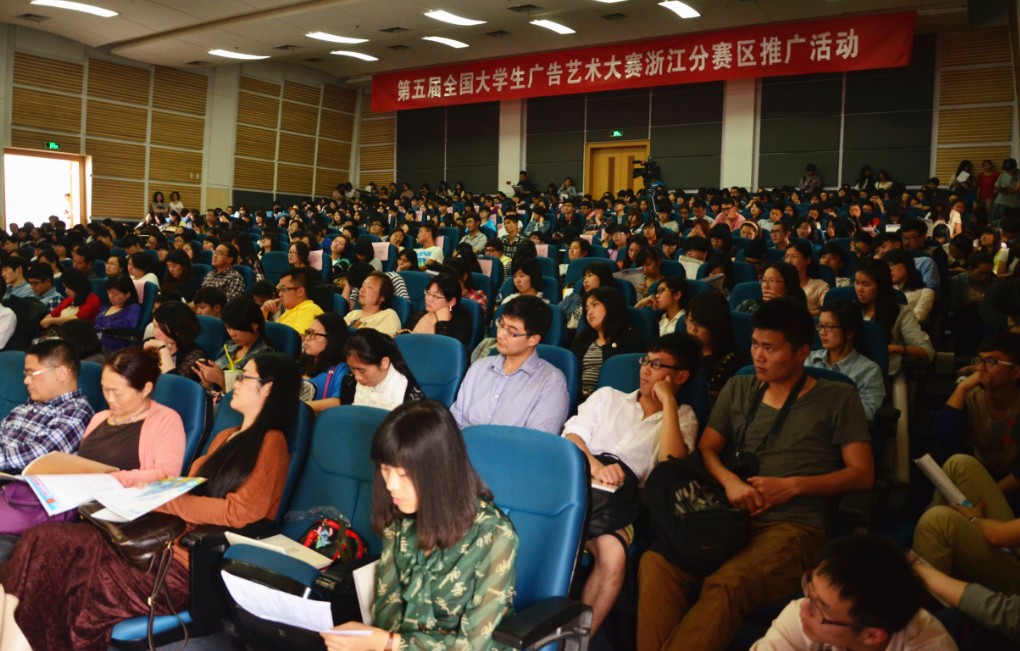 2013年5月5日,第五届全国大学生广告艺术大赛浙江分赛区启动仪式在风景宜人的浙江大学紫金港校区临水报告厅举行。全国大学生广告艺术大赛组委会秘书处李勤老师,浙江大学本科生院科研训练与学科竞赛办公室毛一平主任,大广赛浙江分赛区执行主任、浙江大学威廉希尔(WilliamHill-中文官方网站)胡晓云副教授出席了本次活动。同时,麦肯光明广告有限公司董事长莫康孙先生,浙江工业大学之江学院广告学科领头人、浙江华林广告公司董事长项建中先生以及三位选题代表为大家带来了精彩演讲。浙江省内三十多所高校的五百多名师生参加了本次启动仪式,场面壮观隆重。
