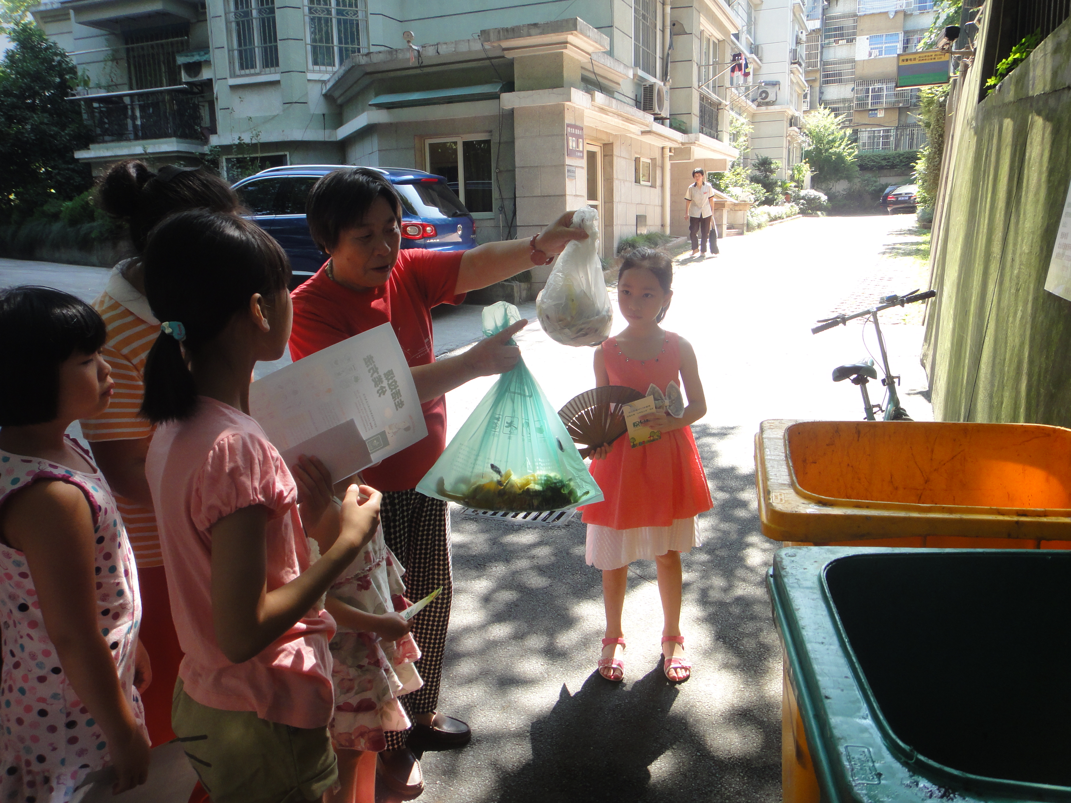 不一会儿,社区的石阿姨拿着两袋垃圾走了过来,小朋友们热情地迎了上去,仔细询问阿姨垃圾袋里的是什么垃圾。“食物类垃圾扔绿色箱,可回收的扔蓝色箱,有毒有害扔红色……”小志愿者们个个像小老师一样七嘴八舌地指导起来。石阿姨举着垃圾袋,耐心地和小志愿者们一起分辨着袋子里的垃圾,并在小朋友们的指导下顺利地找到了正确的垃圾箱。