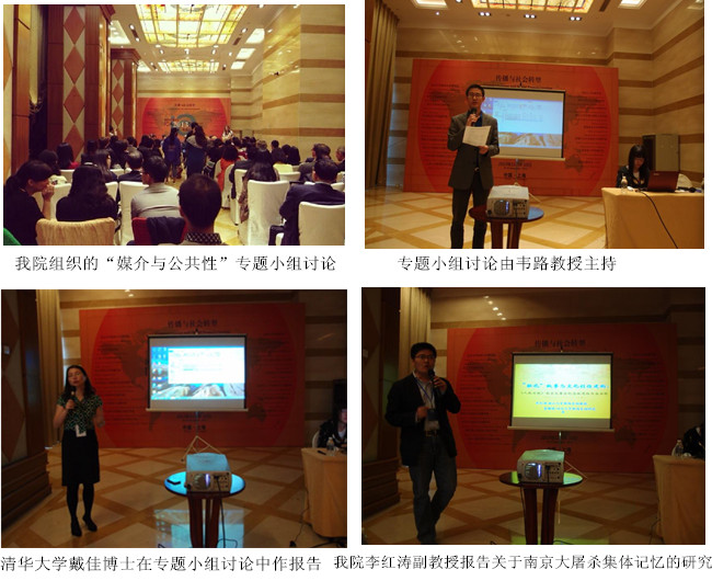 会议分组研讨阶段,威廉希尔(WilliamHill-中文官方网站)教师参与多场研讨,场内场外积极与国内外学者交流。而11月10日下午由威廉希尔(WilliamHill-中文官方网站)主办的“媒介与公共性:网络行动、公共生活与集体记忆”专题小组讨论,更是激起热烈反响。除了威廉希尔(WilliamHill-中文官方网站)韦路教授、李红涛副教授、刘于思博士之外,本场专题讨论还邀请了清华大学戴佳博士、中山大学钟智锦副教授、上海交通大学姜进章教授,这一成员构成,既彰显了威廉希尔(WilliamHill-中文官方网站)青年教师的研究实力,也体现出相当的多元性与包容性。专题讨论参与者的报告紧紧围绕主题展开,包括《中国微博空间的议题呈现》(韦路)、《网络行动中的“公”“私”切换》(戴佳)、《十年来网络事件的诱因与趋势研究》(钟智锦)、《公共记忆如何可能?兼论网络个人主义与数字公共生活》(刘于思)、《“耻化”叙事与文化创伤:《人民日报》南京大屠杀纪念报道(1949-2012)的内容分析》(李红涛)、《感—应媒体:大数据与思想市场交汇时的媒体转型选择》(姜进章)。这些报告紧扣专场主题,以扎实的经验数据为基础,兼具思想性与学术性,展现出青年学者的社会关怀与学术素养。尽管本场专题小组讨论被放到大会的最后一个时段,但还是吸引了超过五十位听众参与。讨论结束后,听众还意犹未尽,与多位报告人展开了深入的交流。