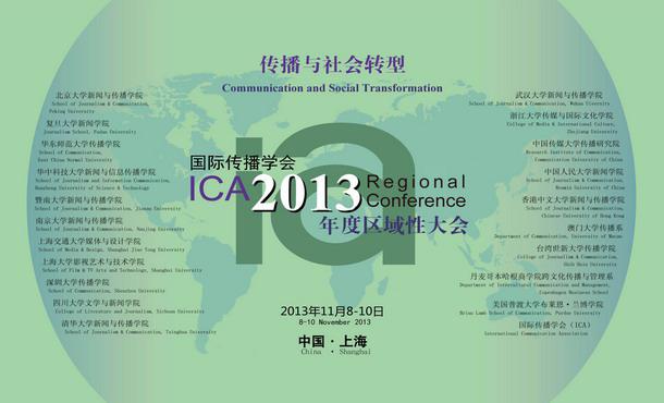 2013年11月8日-10日,国际新闻传播学界最具影响力的研究团体——国际传播学会(ICA)2013年度区域性大会在沪举行,这是该学会成立64年以来,首次登陆中国召开大会。大会主题是“传播与社会转型”,吸引来自世界18个国家和地区的300多名专家学者、高校师生与会。大会共设30个专场,包括16个英文专场,14个中文专场。这些专场涉及政治传播、社交媒体、传媒实力、全球传播、文化产业、健康传播、媒体素养、社会运动等诸多领域,与会者从不同的角度对巨变中的媒体环境与社会转型二者的关系进行了深入的探讨。