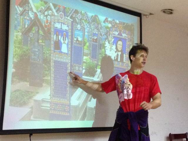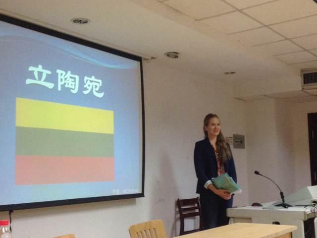 此时,留学生们开始分享自己的跨文化之旅了。来自罗马尼亚的王博分享了他的主题:东方与东方。除了地理位置的描述之外,他还指出饮食方面的差异,在他们看来肉是不应该做成甜的,甜甜的肉让他觉得如同吃点心一样,很是奇怪。他还列举以前去一个中国朋友家,朋友说他们家是农村,可在王博看来,那简直就是一个现代化的城镇,和罗马尼亚的农村有着天壤之别,罗马尼亚的农村比较朴实与接近大自然。他又说道中国人一般会避免说到“四”,而罗马尼亚人对死亡的概念却比较乐观好玩,最后王博又提到了罗马尼亚是吸血鬼的故乡,并着重介绍了吸血鬼的起源:中世纪国王弗拉德·采佩。两位来自乌克兰的同学介绍了他们眼中的乌克兰和中国的区别。分别从国土面积、邻国多少、人口差距、宗教不同、国旗的对比以及城市之间的对比来分享他们的感受。他们还通过服饰和饮食来看中乌的文化差异,其中一位乌克兰男生说不喜欢甜的面包,在他们的家乡一天三顿都会吃咸的面包,这与中国南方以米饭为主食的饮食差异比较大。接着是来自立陶宛的伊薇给我们分享了立陶宛的文化,她说在立陶宛有两种宗教,一种是天主教,另一种是篮球。每个家庭都会与篮球紧密相连,这项运动是他们文化的象征。立陶宛的风景与中国的有山有水不同,他们是:有水、有森林。他们尊重自然,沙滩旁边不建高楼大厦。最后伊薇通过琥珀对立陶宛如同玉对中国的关系,她跟我们分享了一个感人的爱情故事,从而说明了琥珀的来历。最后一位作分享的留学生是来自韩国的孙周星,他指出韩国人爱喝凉水,从小就喜欢把水放在冰箱里面冰镇以后来喝,这点与中国的温开水是有很大差异的。接着他又从中韩的酒文化的差异、中韩餐具的差异,以及银行的设计等表达了一种有趣的差异感。在韩国身份证是用来买烟酒的,而中国是用来买火车票的,等等这些有趣而不同的现象都从方方面面体现着文化的差异性。