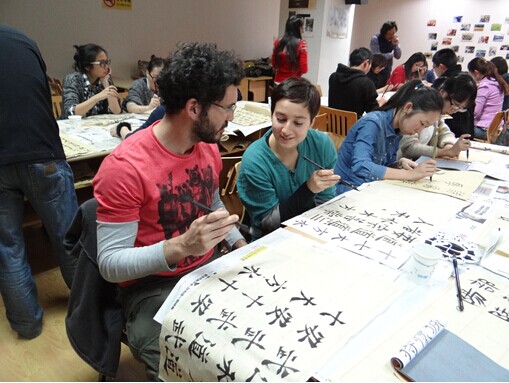 在同学们写字的过程中,沈老师还不时四处巡视,对同学们加以指导。中国学生中不乏有过一定书法基础的,而很多留学生本来完全没有书法功底的,沈老师就从旁指导。