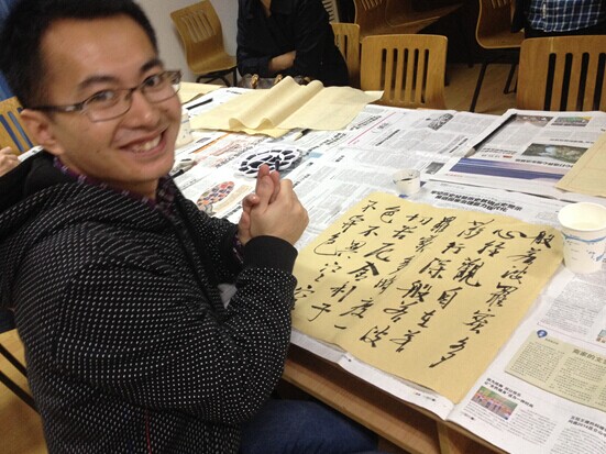 本期活动聚集了2014级汉硕的中国学生和各国留学生,还有特地从玉泉和紫金港来的同学。本期活动分为五个环节——沈老师书法小课堂、舞文弄墨书法体验、评比与奖励、小游戏看画猜诗、下期预告。沈语冰教授在书法上有极深的造诣,为我们介绍了中国历代书法名家王羲之、颜真卿、诸遂良、董其昌等书法大家的作品和特点,讲述了书法在中国文化中的地位:中国人认为书法能反映一个人的人格修养,练书法可以修身养性,正所谓“字如其人”;同时展示了自己临摹的书法作品,坦言书法之中实在含有无限乐趣,自己常常写字写得忘记时间的流逝,就这样度过一整天愉快的时光。最后为初学者指出了书法入门的一些实用的基本方法。
