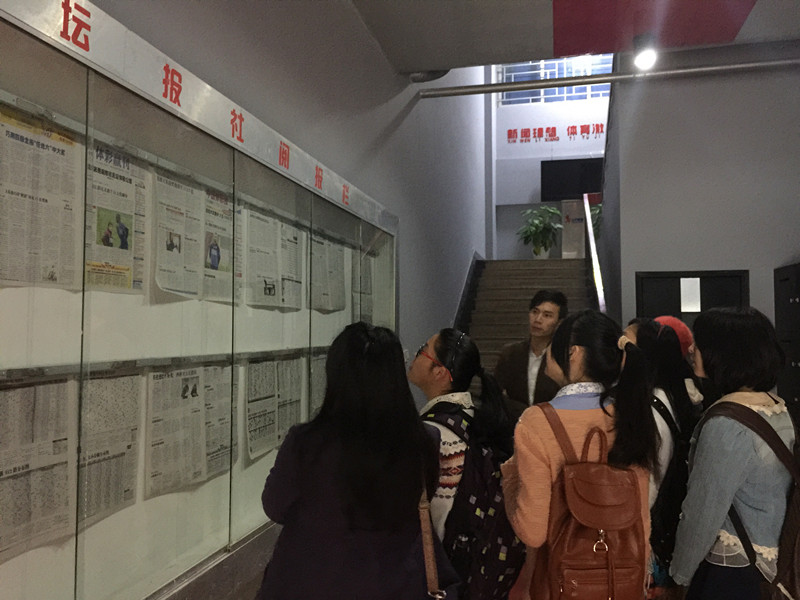 在报社里,成员们在《体坛报》新媒体部负责人沈邬君主任的热情陪同下,对报社各个部门进行了深入接触。在编辑部里,年轻的报社编辑们以手头的工作为实例,向成员们分享编辑工作流程;在校样室里,两位资历深厚的前辈为成员们介绍了校样的过程、工作细节及经验,并语重心长地对未来的新闻从业者们说:“要成为一名合格的新闻人,一定要把握细节、脚踏实地。”