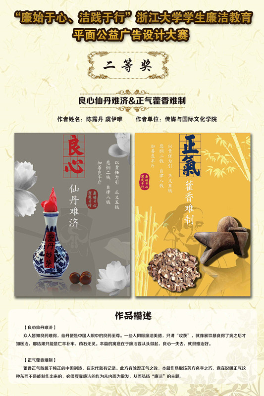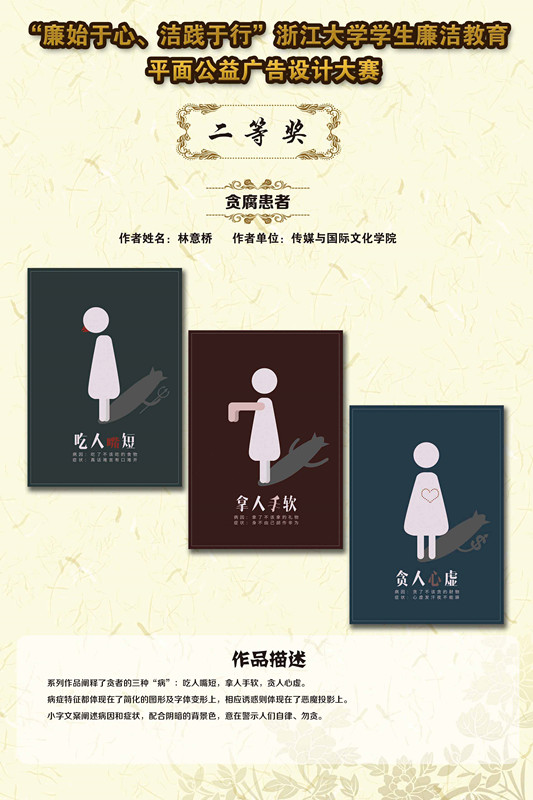 参与此次大赛的每件设计作品都体现除了参赛者的独特思想和专业技巧,寓意深刻,发人深省。决出的作品当中将有部分刊登在浙江大学纪委刊物《清廉浙大》 上。