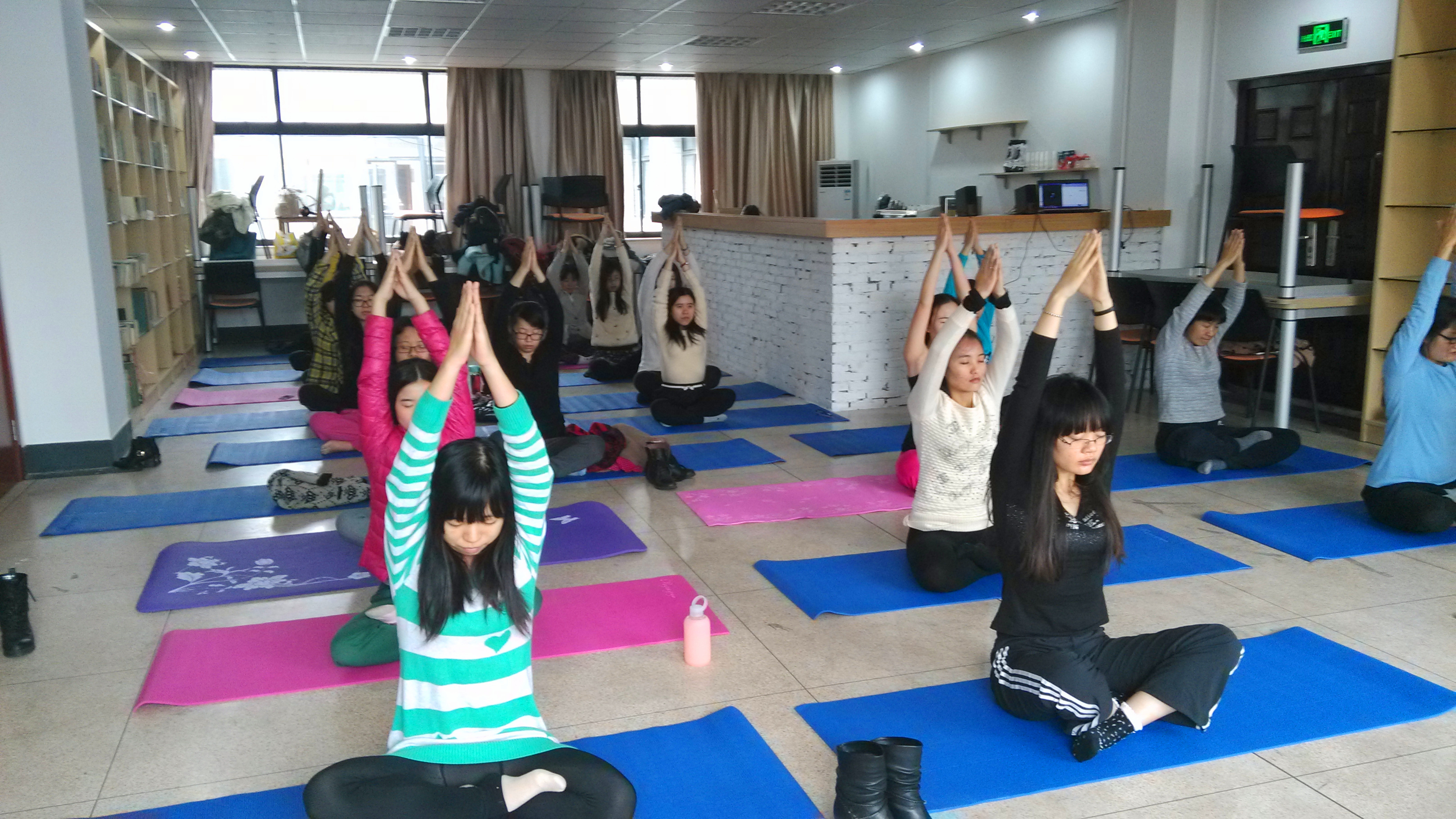 咖啡吧温暖明亮,音乐声袅袅,盘坐在瑜伽垫上的师生们都闭目呼气,慢慢沉浸在舒适安宁的情绪中。“大家想像自己身处在大草原中,很放松很放松······”瑜伽赵老师是我校能源学院的一名老师,也是练习十余年的瑜伽爱好者,她走到大家身边,轻柔地纠正着部分同学的动作,“把背挺直,胸抬起,整个人向上拉伸,深呼吸,慢吐气。”