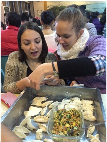 大家都在认真地包饺子,来自土耳其的黄石怀(图左)是穆斯林,不吃猪肉。为了照顾穆斯林同学,张丽萍老师还贴心地带来了素饺子馅。