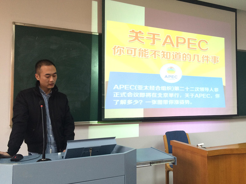 紧接着,由胡烈飞同学为大家做了一个主题演讲,讲解了APEC包含的成员国、成立的历史和战略举措,介绍了此次APEC峰会的突破——启动亚太贸易区猜想以及此次北京峰会的丰硕成果——通过了《北京纲领》和《亚太伙伴关系声明》,进一步明确了亚太地区经济合作的方向和目标。他还讲解了“建立亚太经合组织反腐执法合作网络”、“实现全球价值链供应链领域合作倡议”、“区域一体化”等概念,并强调了APEC北京峰会的重大意义:它是我国外交史上的重大事件,关乎亚太地区的繁荣与稳定、和平与发展,涉及我国多边外交关系和战略部署,其意义和影响不容小觑。