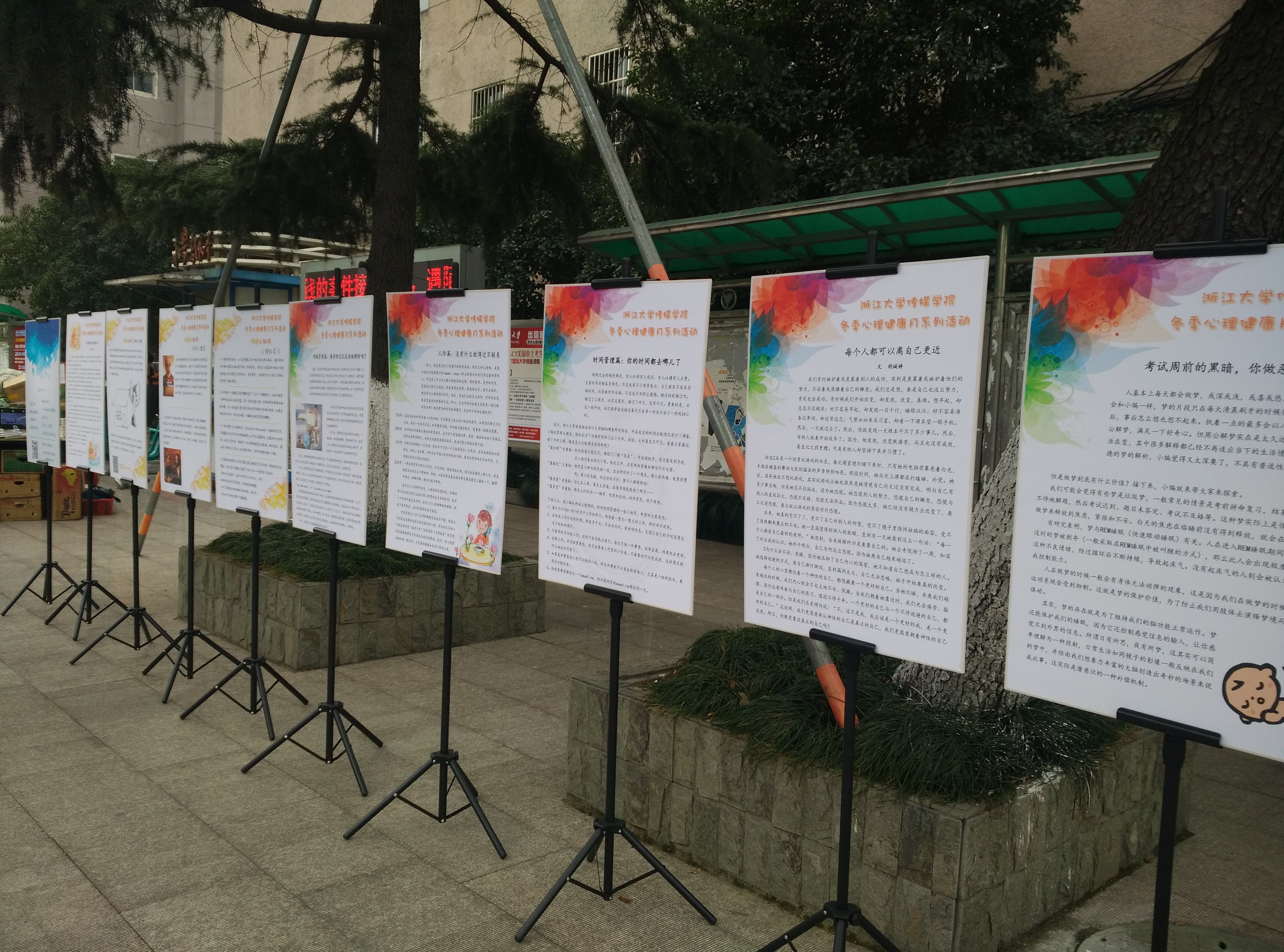 “这个心理测试很有趣,测试方法简单,答案也很有专业性。正好饭后消食一下,(这些展板)还是挺有趣的”。男生有些诧异突然被提问,有些不好意思地笑笑回答道。当被问及这些内容是否对其有帮助时,这位从玉泉过来找同学一起自习的同学很自然地指了指“考试周前的黑暗,你做恶梦了吗?”这篇展板小文,又指了指背上的背包。沉甸甸的背后,里面大概都是课本、资料、电脑等复习用具,考试周的压力可想而知,“关于考试的内容很应景”,男生肯定了展板的作用。