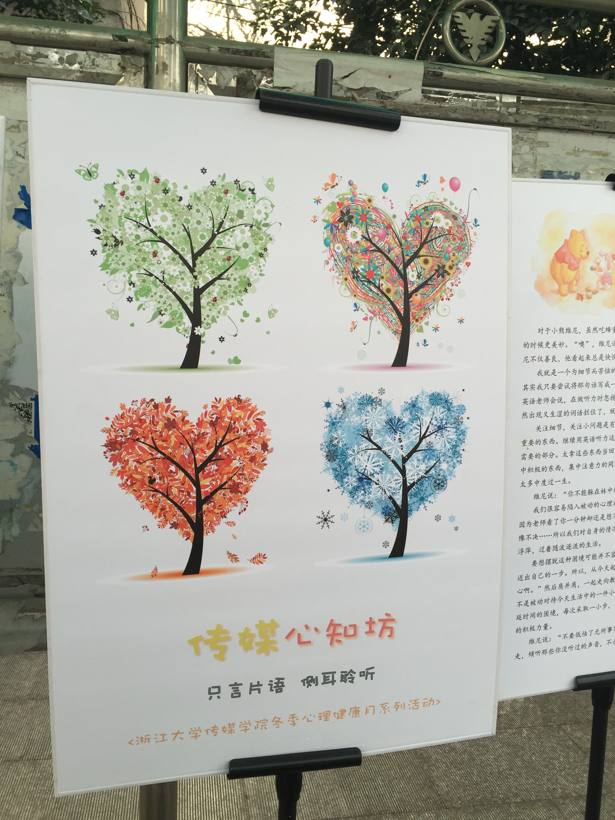 小姑娘说最喜欢展板上制作有维尼熊配图的文章《小熊维尼的幸福贴士》,看不懂文章内容,母亲便弯下腰来给女儿解释,说小熊维尼是怎样变得每天快快乐乐的。小姑娘摇头摆脑地听着,一副可爱小学究的样子伸出手指对着文字比比画画,一会儿又被边上展板漂亮的四季树图片吸引了目光,便迫不及待拉着妈妈一起猜哪棵树是春天的树,哪棵树又是冬天的树呢?