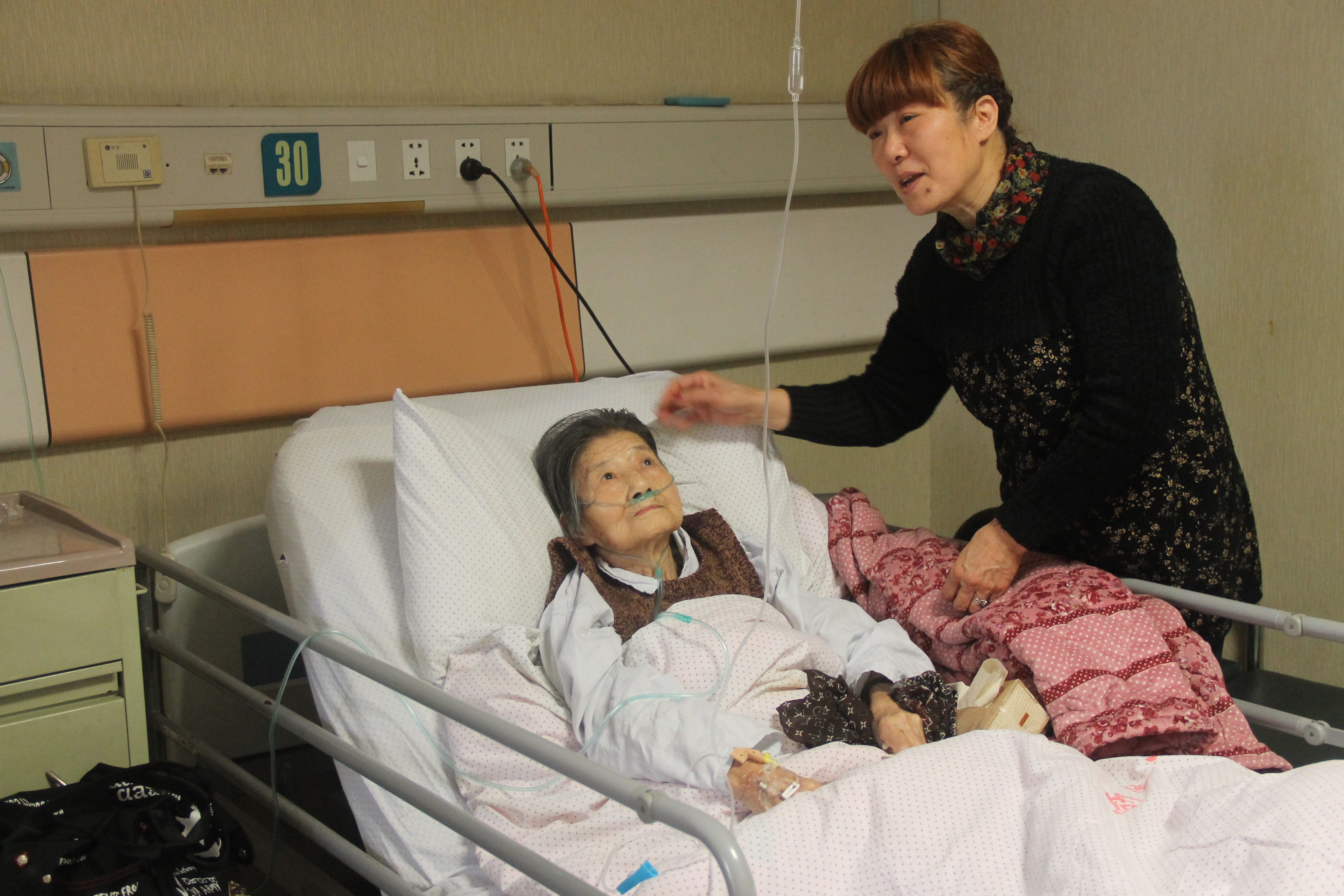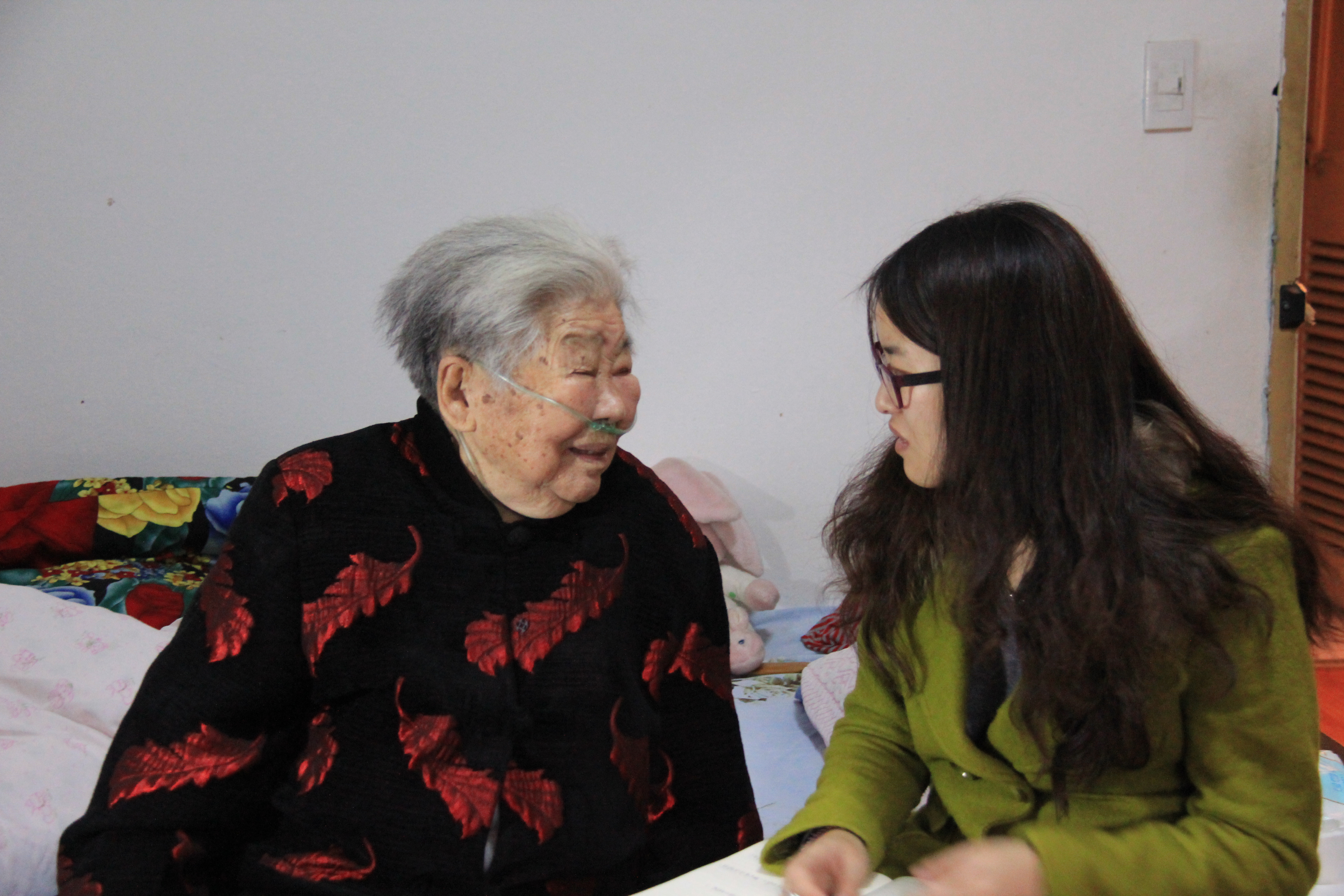 身体状况同样不佳的,还有张凤英和曹雅素老教师,两位参与抗战的巾帼英雄。张老师卧床多年,聊天交谈的时候,经常气息不稳,但一聊起加入共产党的话题时,张老师双眼里泛光,坦言自己入党“是真心的”。她是1945年6月入的伍,用美妙歌声鼓舞士气、抚慰心灵,直至抗战胜利。与曹老师的交流是在病房中展开的,她小小的身体藏在厚厚的白色棉被里,手上还挂着点滴。因为听力的严重退化,每一次提问都要请她的女儿张老师,俯身贴着曹奶奶的左耳,大声而缓慢地用带着宁波口音的杭州话复述。我们是从曹老人师断续续的点头,转动眼睛,或者是轻如蚊鸣的细微话语中慢慢了解到,1942年加入浙东新四军后,她在妇女大队里从事针线活,默默缝制衣物、日用品等来支持前方浴血杀敌的战士们。