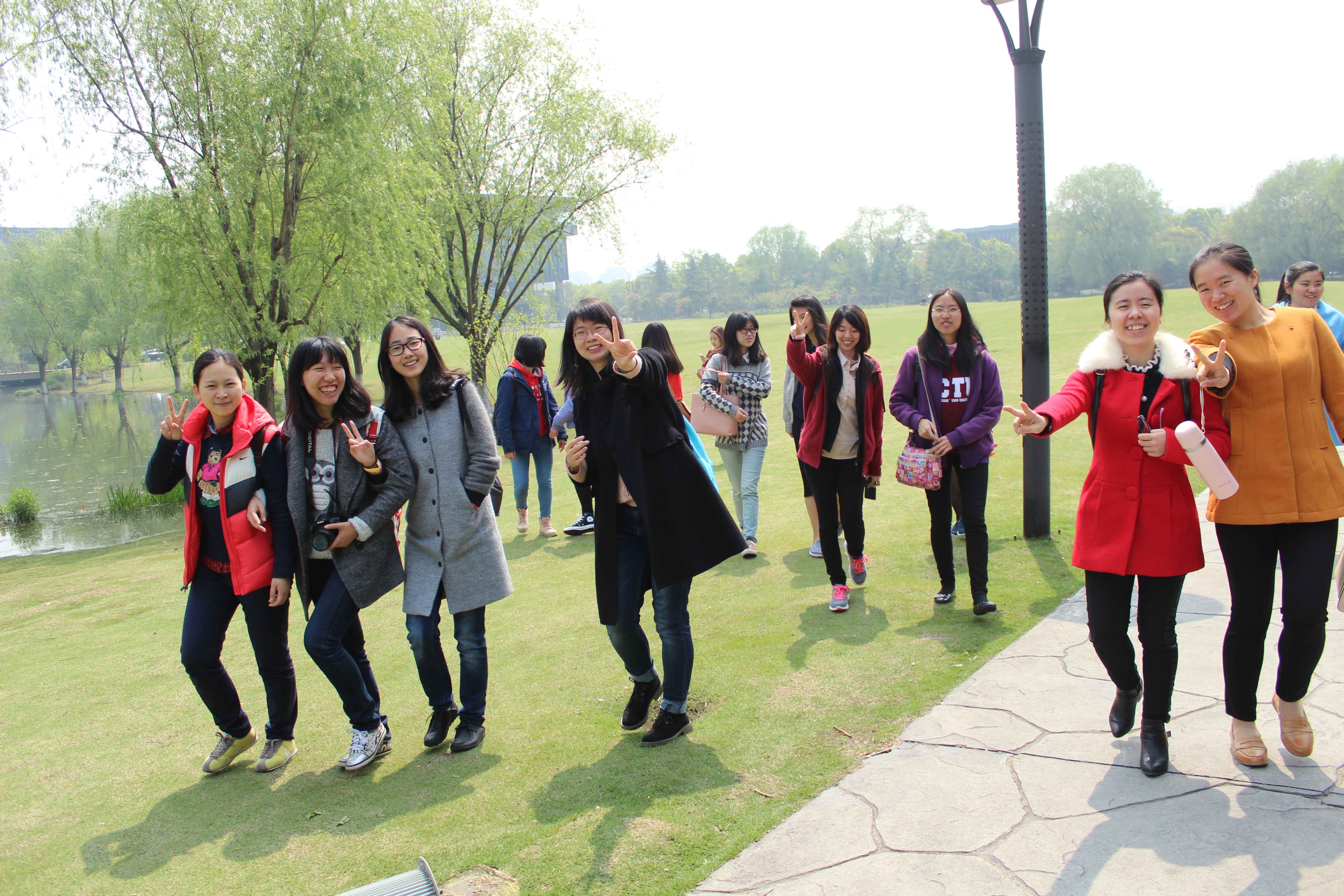 一早的愉快的交流会结束后,10点30左右同学们乘车来到浙江大学的紫金港校区,大家都被这里宽敞的校园所吸引,蔚蓝的天空,初春的绿盈盈的草坪,还有碧波荡漾的水面上不时悠哉而过的黑天鹅,都让同学们举起了手机和相机,不停地合影留恋。