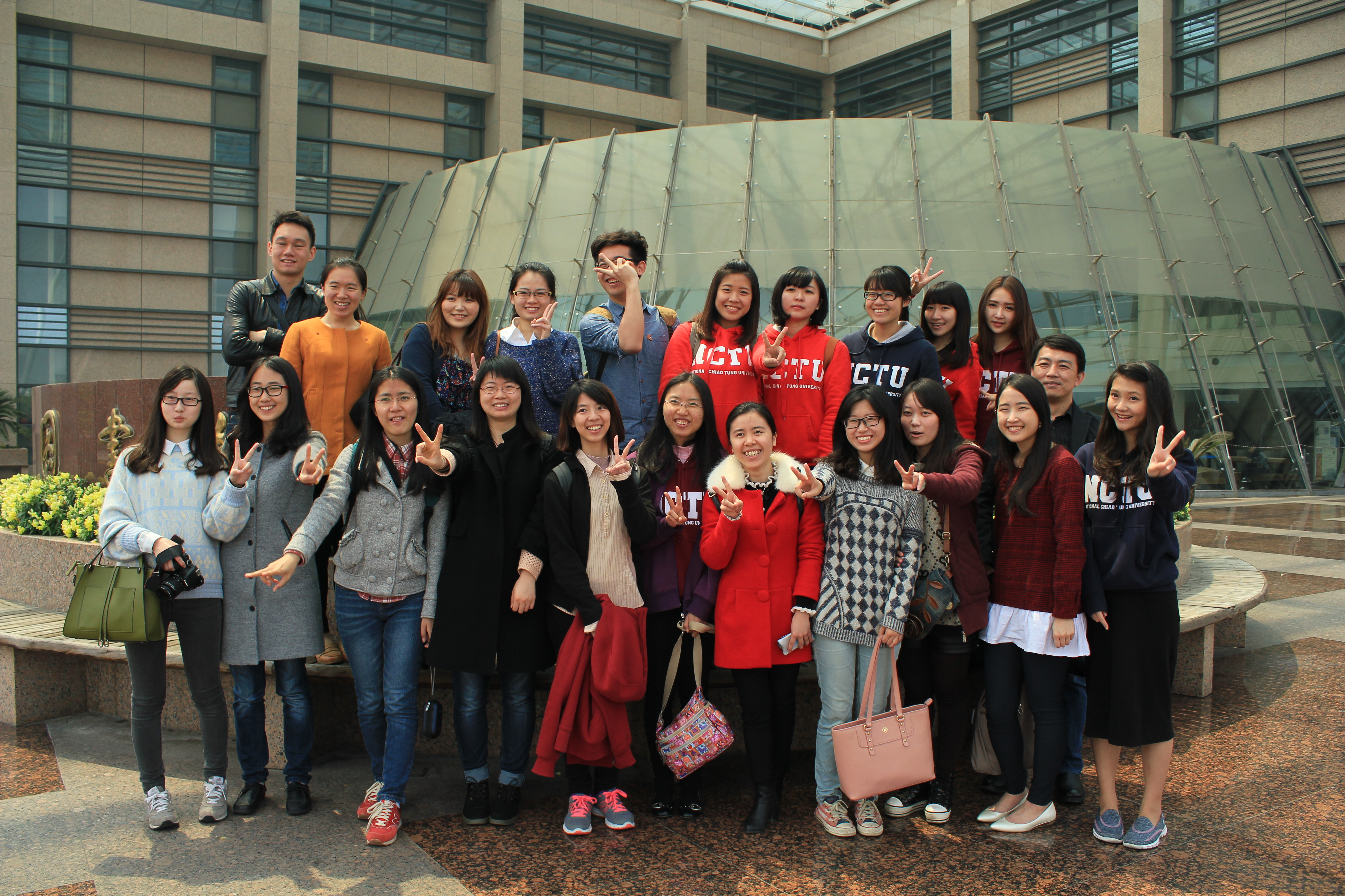 浙大和台湾交通大学的师生们在图书馆门前合影留念。大家共同喊出“茄子”时的笑容与当天的阳光一样灿烂。
