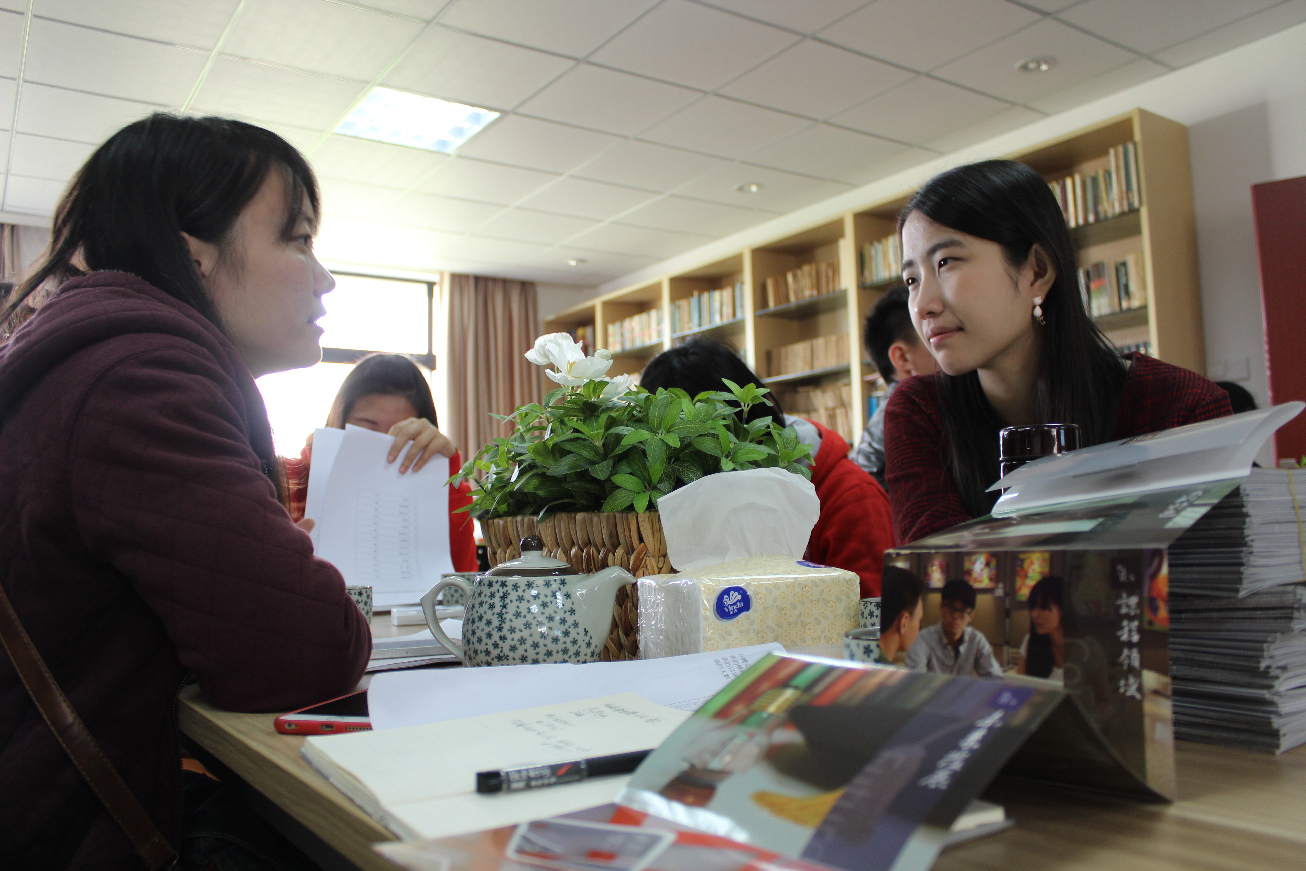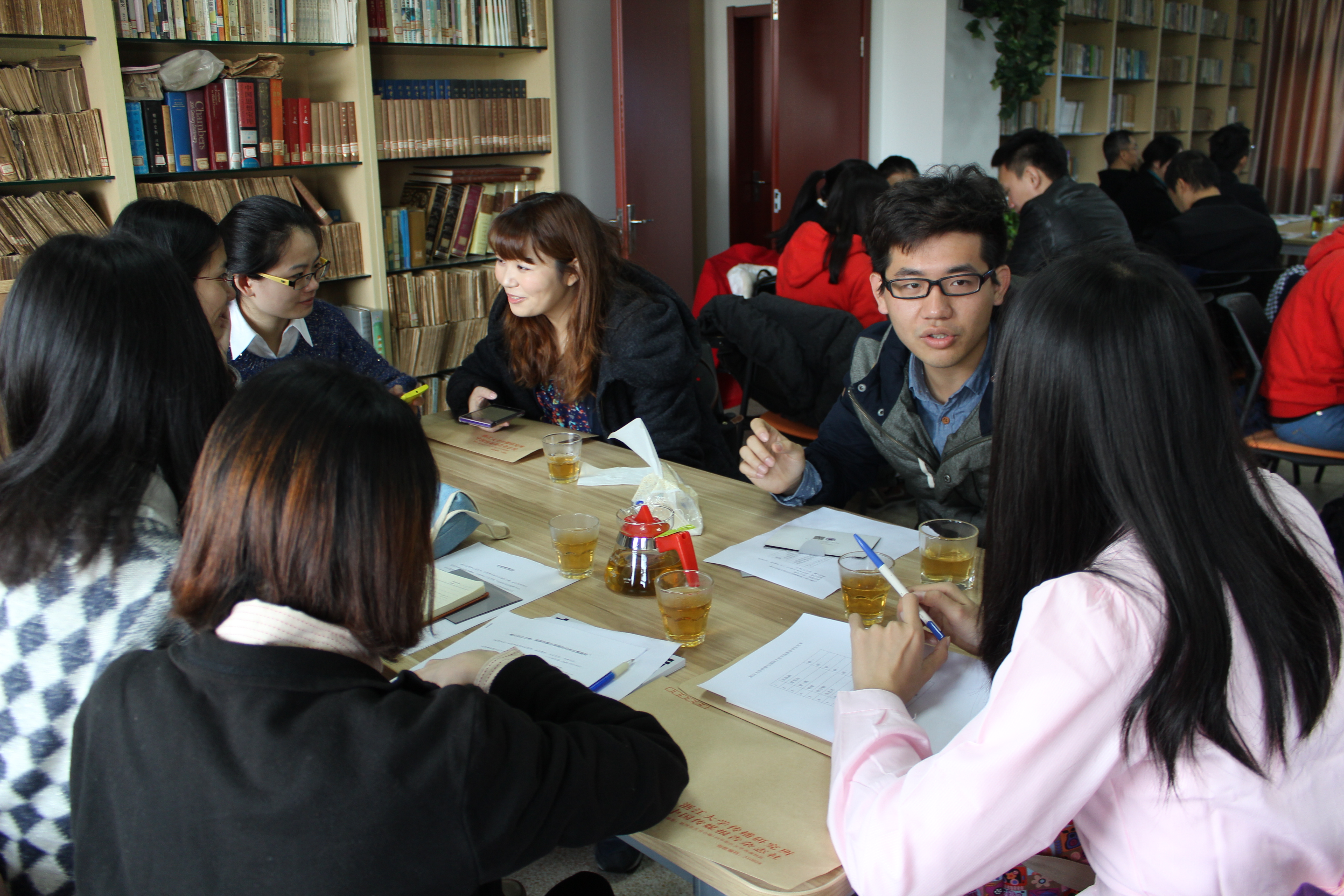 会上台湾交大和浙大的研究生交叉落座,五六个人为一桌,同龄人愉快交流,十分自在地熟络起来。传媒学院党支部副书记王玲玲老师用杭州美好的春天做引,表达了对台湾交大师生访问团的热烈欢迎,开启了两所高校之间的交流会。