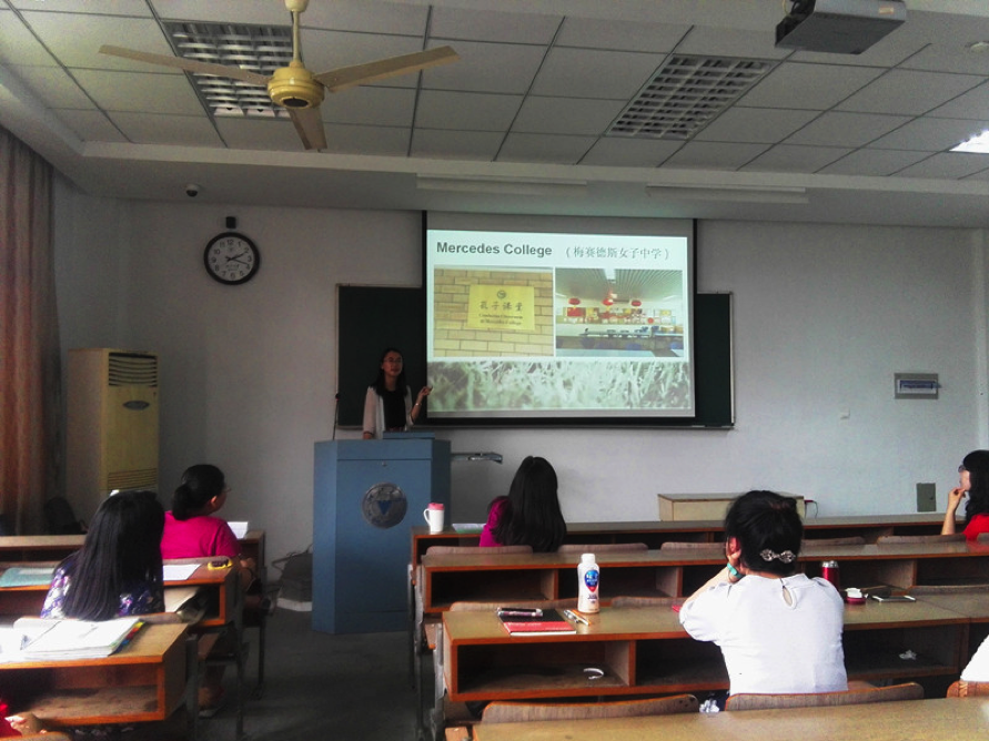 经验交流会由马慧霞学姐首先发言,她介绍的主要是自己所任教学校的基本情况。马学姐的学生基本是小学生,他们生性好学又活泼可爱,课堂教学形式寓教于乐,经常安排做面具,读儿歌,给图片涂色等小活动,深受当地学生的喜爱。但由于小学生学习能力较差,经常是一个简单的句型反复操练多次才能学会,如:“我买水果。”。学姐还介绍了澳大利亚汉语学习着的基本情况,以及她教学所使用的教材《汉语起航》。与马慧霞学姐不同,王欢学姐在一所中学执教,她首先介绍了这所女子中学的基本情况,其次讲到了学生们的一些特点,如将汉语作为自己的第二语言修读,但因为汉语难度较大会影响升学考试的成绩,因此一些学生不得不选择放弃;课堂氛围很轻松,学生们甚至可以在课堂上自拍;学生们的听说能力很强,但读写能力明显不足,写作文的时候需要借助网络或字典;最后讲到了当地孔院一些教师并不是中国大陆人,因此带有很严重的口音,语言习惯也与标准普通话有很大的区别,如香港的老师会把“工作”说成“做工”,这一点对学生造成了很大的影响。李牧之学姐主要介绍了自己在澳大利亚与当地人相处的一些心得体会、对跨文化交流的感受、以及如何融入当地文化的一些小建议。