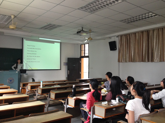 “你们知道‘唐伯虎点秋香’是如何翻译的吗?我们查到的是叫做‘Flirting Scholar’,调情的学者,是不是非常形象?而‘东邪西毒’在英语翻译是‘Ashes of Time’,时间的灰烬,这应该是意译的手法,较为准确地概括了电影的主体内容。”於文汕同学非常认真地给大家介绍了她收集到的一些资料,并主动引导大家积极发言。此外,她还仔细地讲解了有关电影片名翻译的几种方法,在场的同学听了之后都觉得获益匪浅。