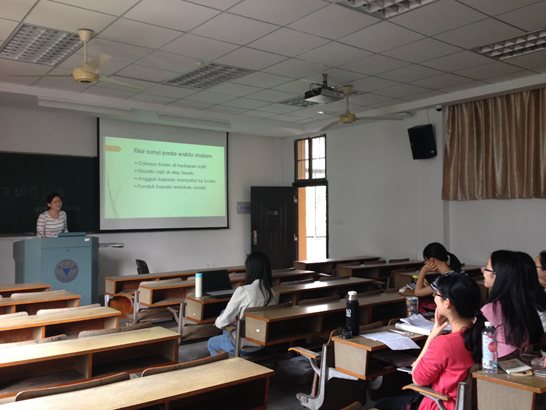 首先,来自马来西亚的留学生钟雨珂为大家展示了一组李白的《静夜思》的英文翻译,拉开了本次翻译分享会的序幕。随后,另外一位同样来自马来西亚的留学生张淑薇还给大家介绍了用马来文翻译的版本。这首耳熟能详的古诗在不同语言的环境背景下,无论是从音调、词语组合、还是韵律上,都展现出了别样的味道,让人不得不感叹语言的魅力。