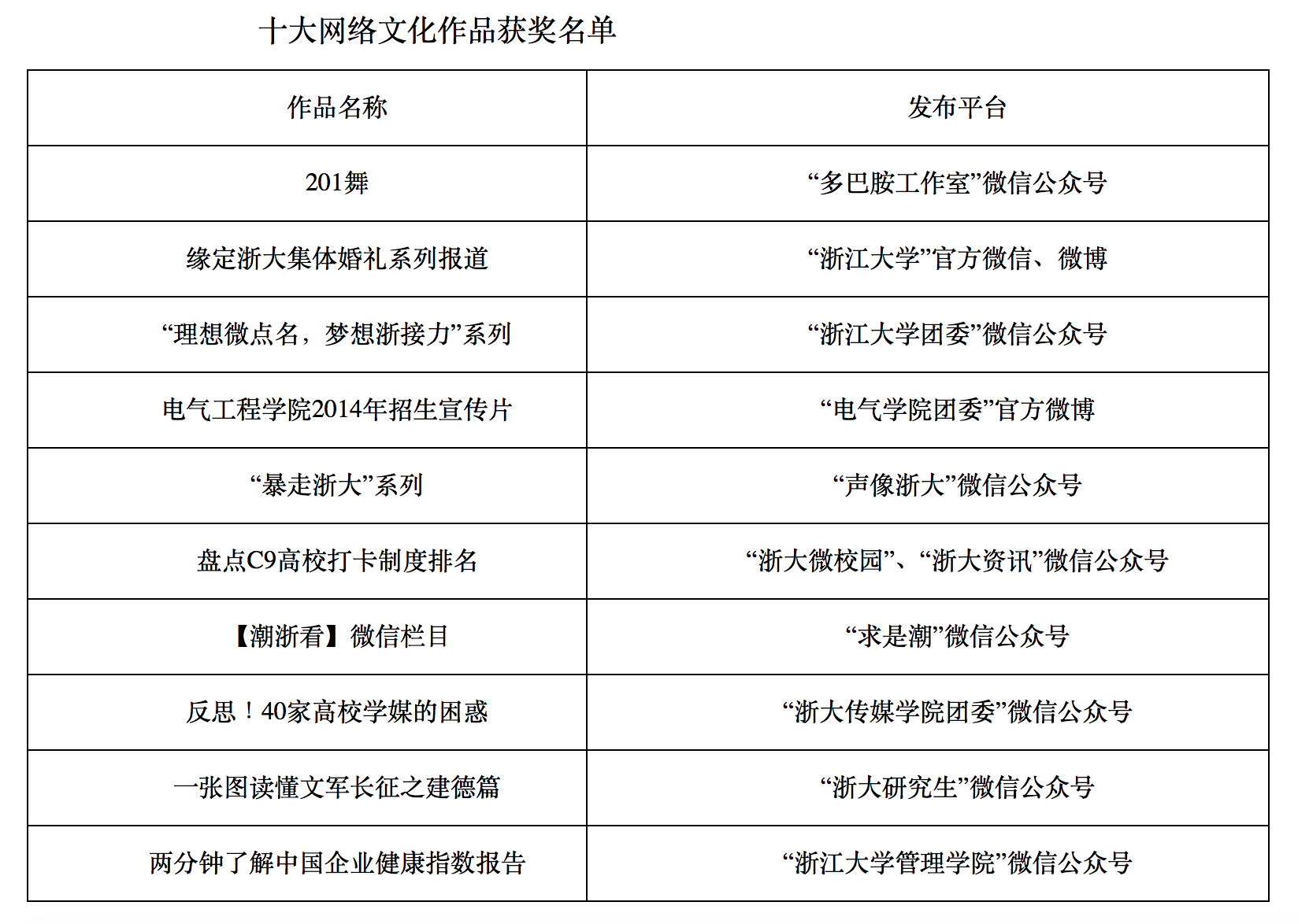 此次活动得到学校各级部门、院系,学生组织、社团的积极申报, 共计收到21家学生网络文化工作室申报材料,收到26件网络文化成果申报作品。最终,经过微信平台风采展示投票与专家评审团的专业评审,评选出以下25项浙江大学网络文化优质成果。