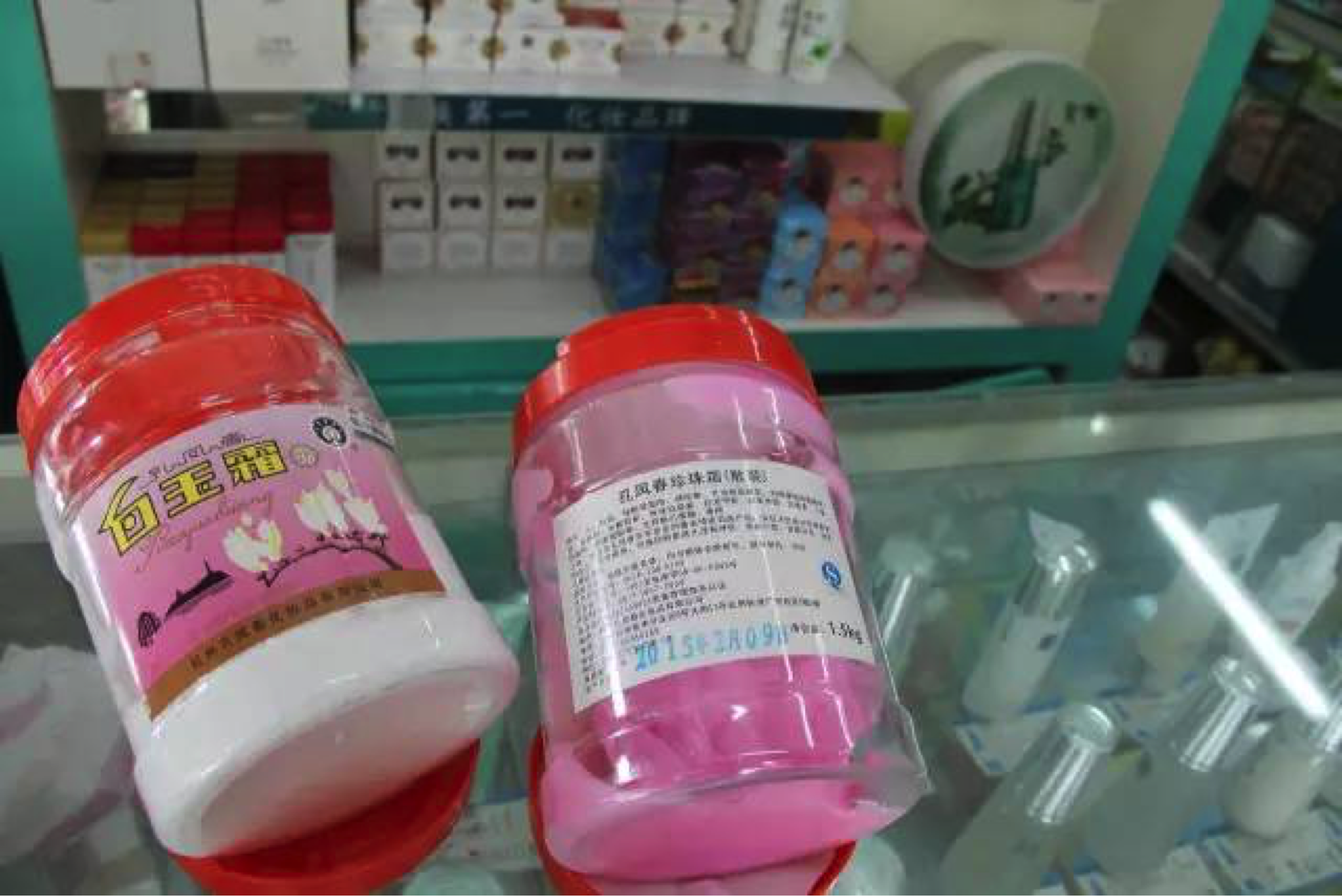 化妆台就在进店处,玻璃柜中有蚌壳油、百雀羚甘油、雅霜、四季头油,但最扎眼的莫过于两大罐招牌孔凤春白玉霜。在不少老杭州的记忆中,冬天大人总会拿着小罐子去家门口的杂货店零拷白玉霜,放到秤盘里一量,几毛钱可以装满小小一罐。白玉霜那香香甜甜的气味、绵绵柔柔的触感,滋润着全家人度过整个干燥的冬天。