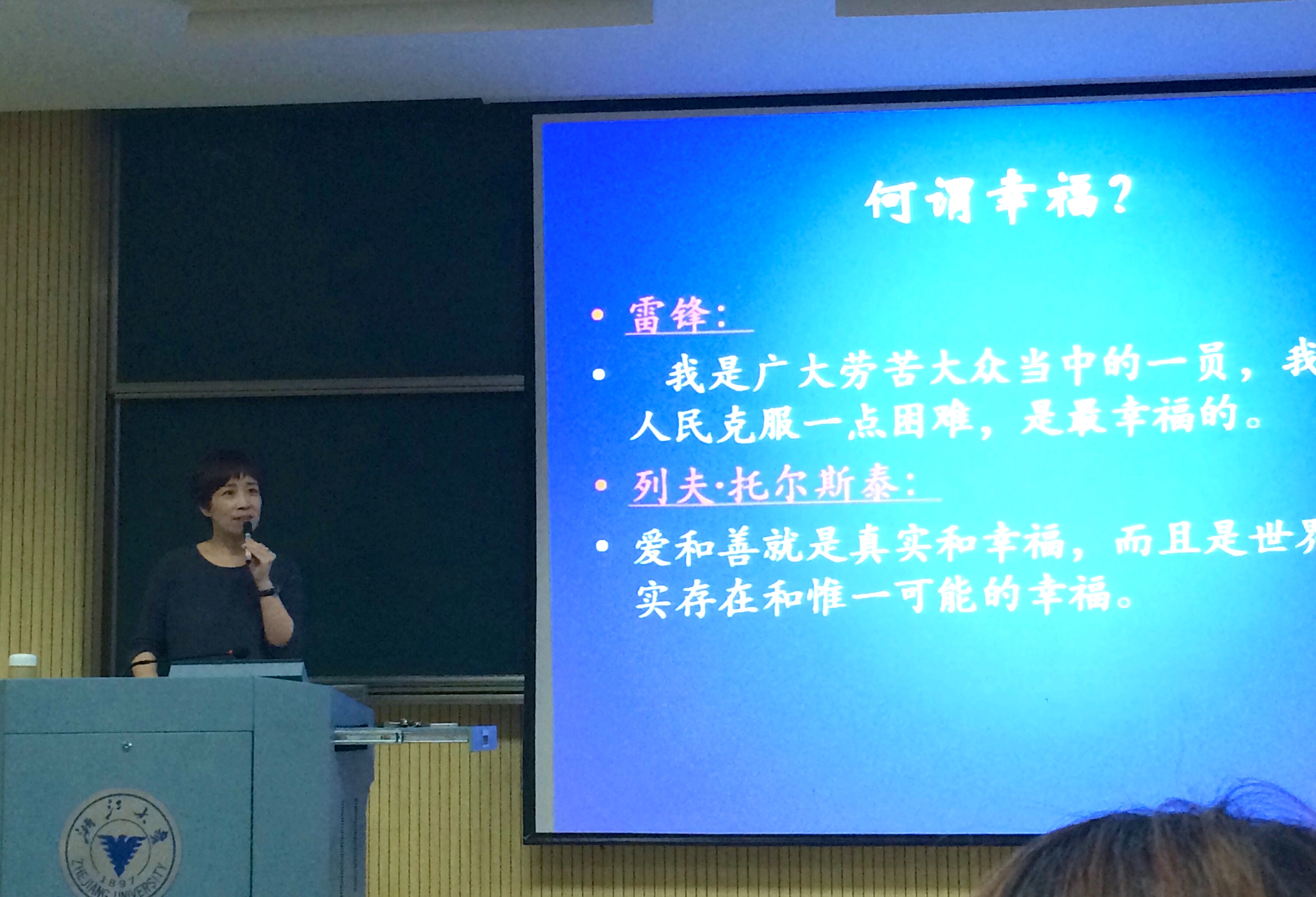 讲座一开始,王玲玲老师开门见山,询问新生何为幸福快乐,并举了《金圣叹之不亦快哉三十三则》的例子,告诉新生想要获得真正的快乐,应该具备善良的品质、爱的能力、行动力,还要有目标和理想以及树立利他的价值观。王玲玲老师说道:“每个人都应带着积极向上的心态开始新的研究生生活,有效地解决问题,把生活、学业、娱乐三者进行平衡,提升心灵的容纳力,从而达到快乐生活。”