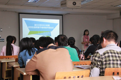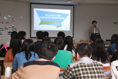 最后,刘岩老师宣布浙江大学2015年度宣传骨干培训班正式开班。伴随着大家热烈的掌声,第一位主讲人严沁老师上台开讲,浙江大学2015年度研究生宣传骨干培训班开班仪式顺利结束,实务讲座拉开了序幕。