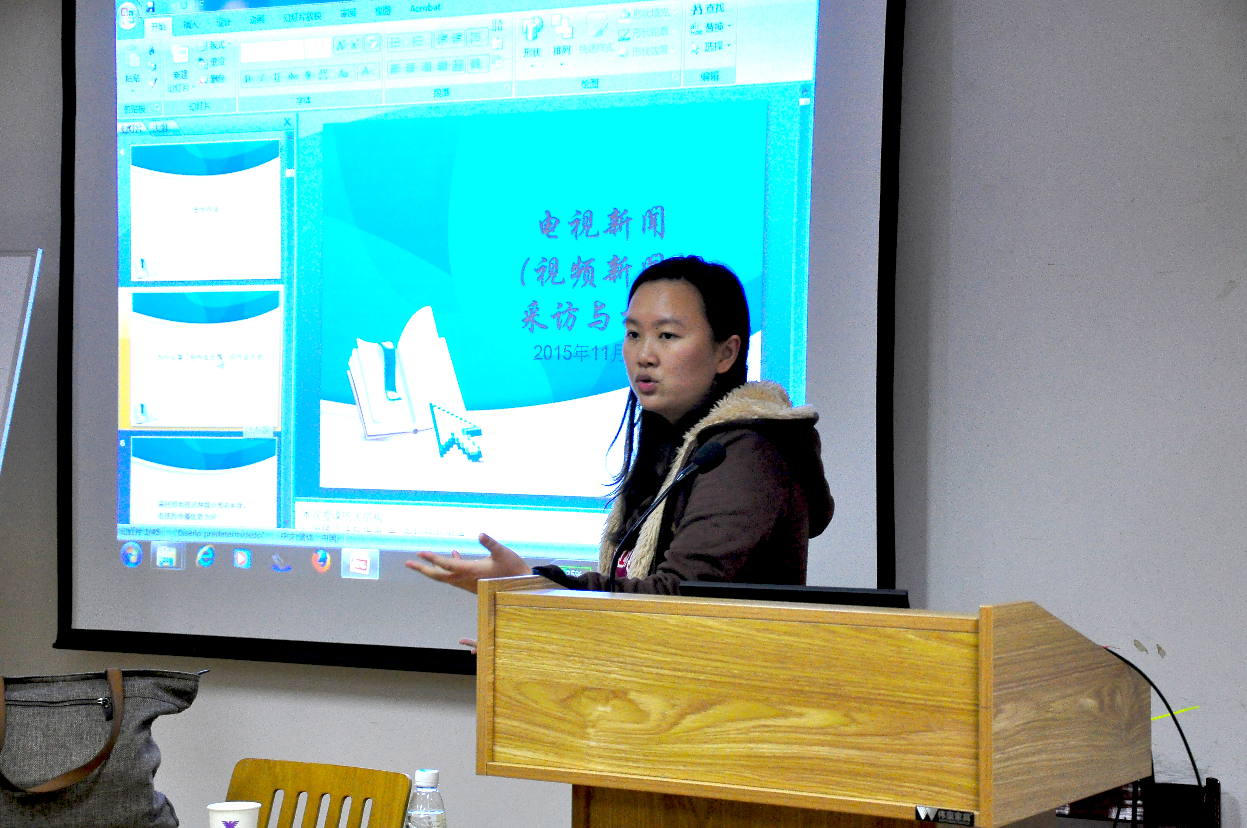 威廉希尔(WilliamHill-中文官方网站)专业教师顾晓燕老师以“电视新闻的采访与报道“为主题,给同学们上了第四课。顾晓燕老师曾在浙江卫视工作很长一段时间,曾获中国新闻界最高奖项,具有丰富的新闻实战经验。她在讲课中通过幽默风趣的语言和具体视频的展示让同学们轻松地理解许多专业知识。她还特别提醒在拍摄方面需要注意的事项,相信对成员在专业性提高方面具有较大帮助。