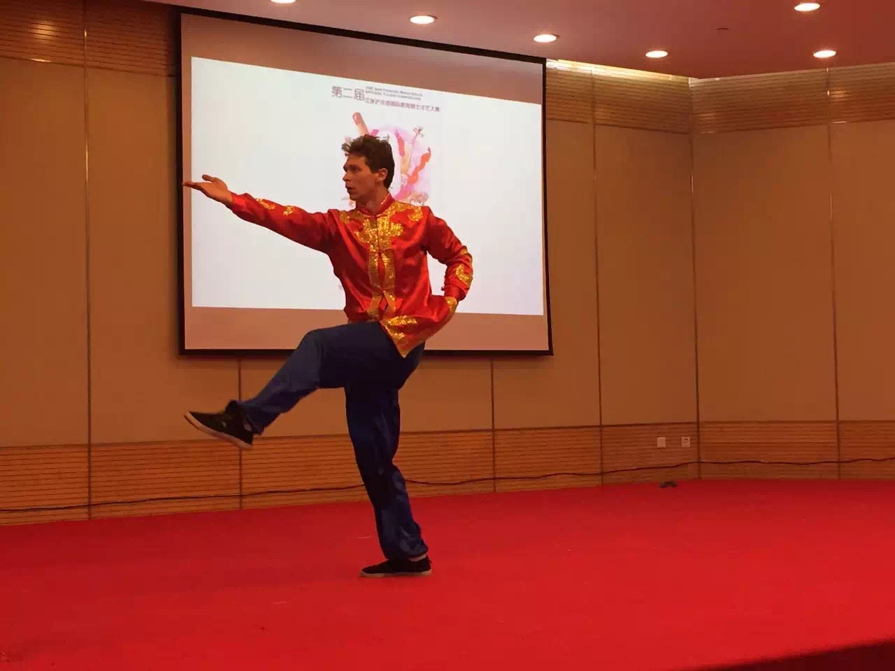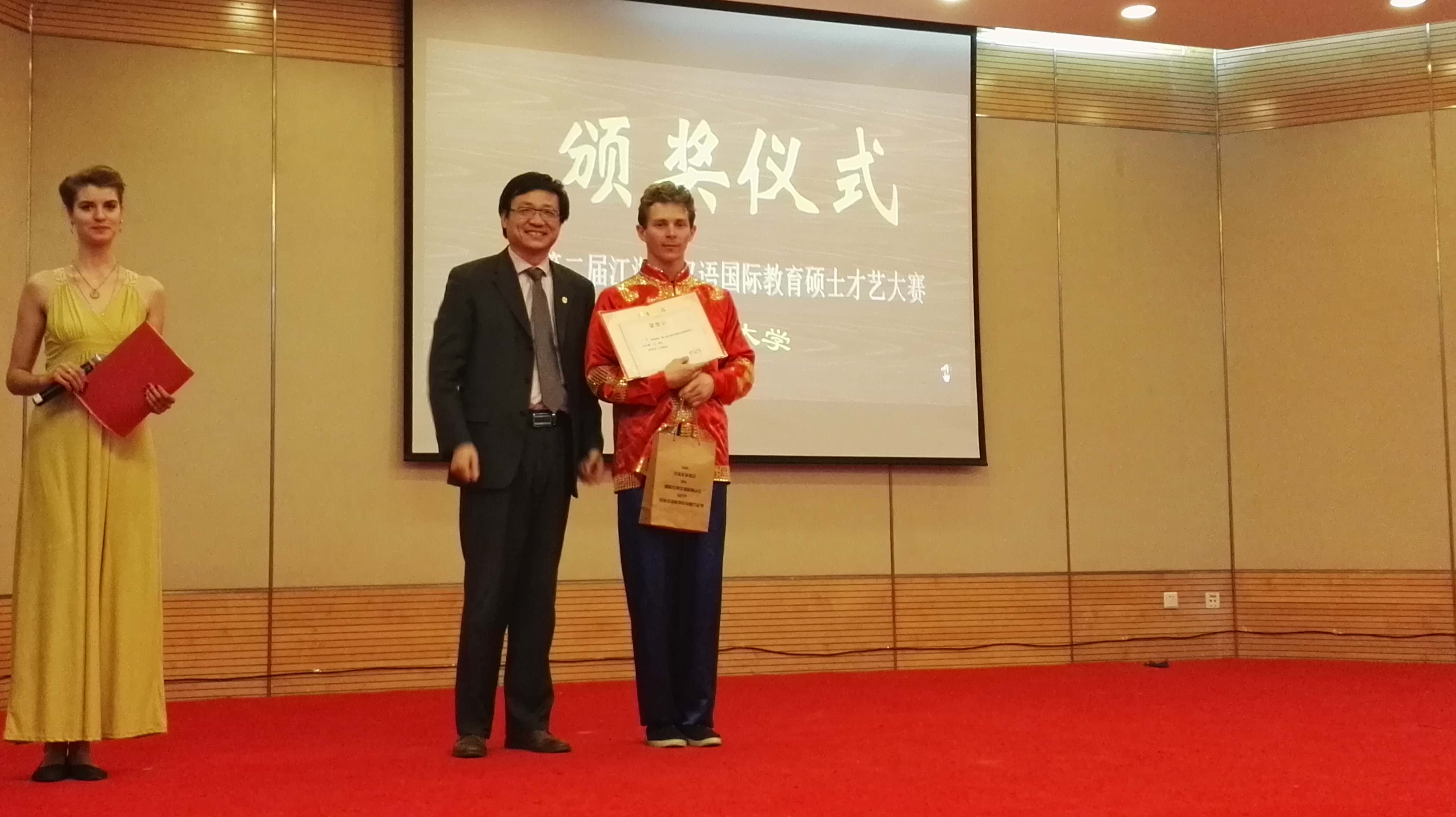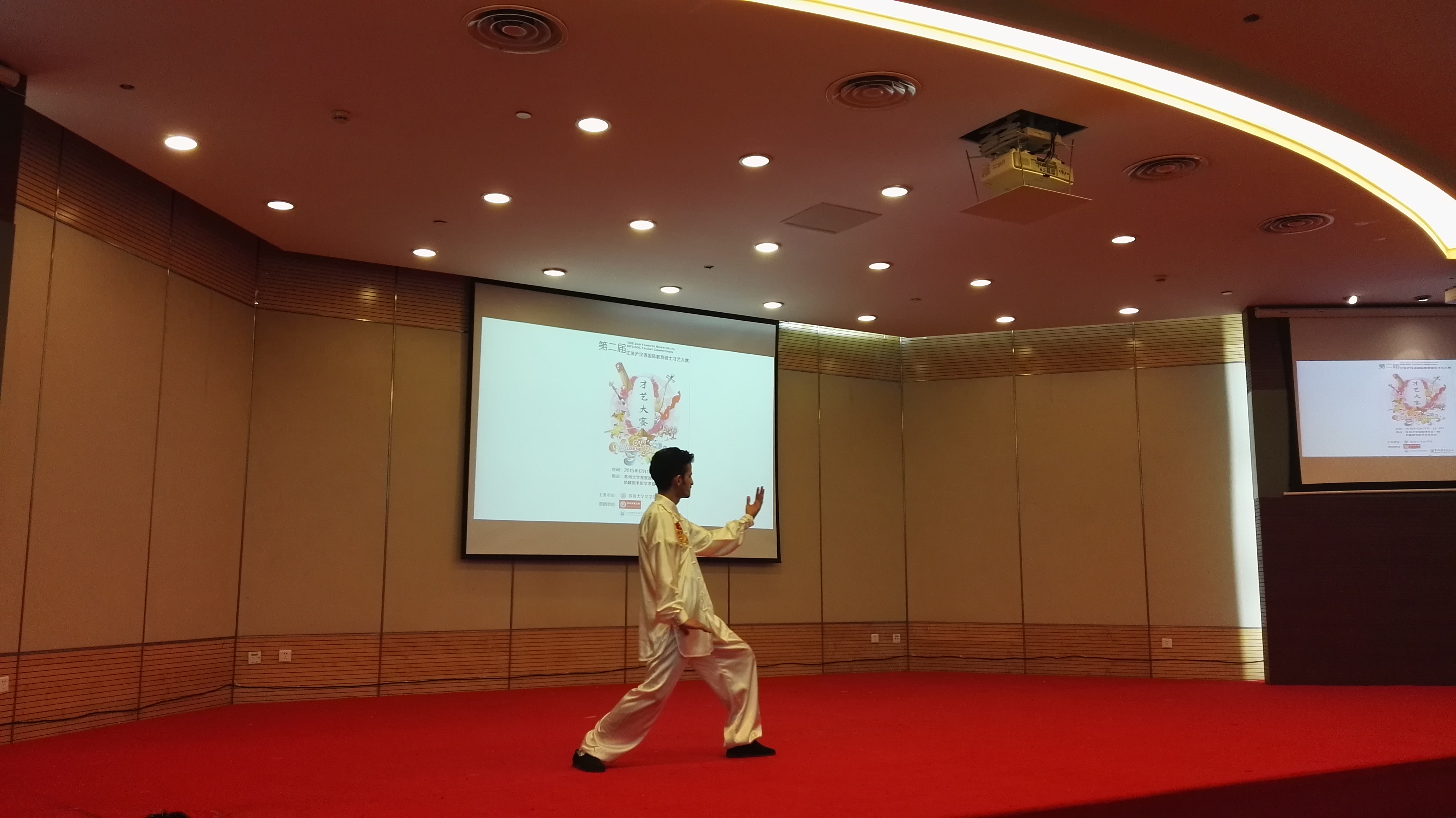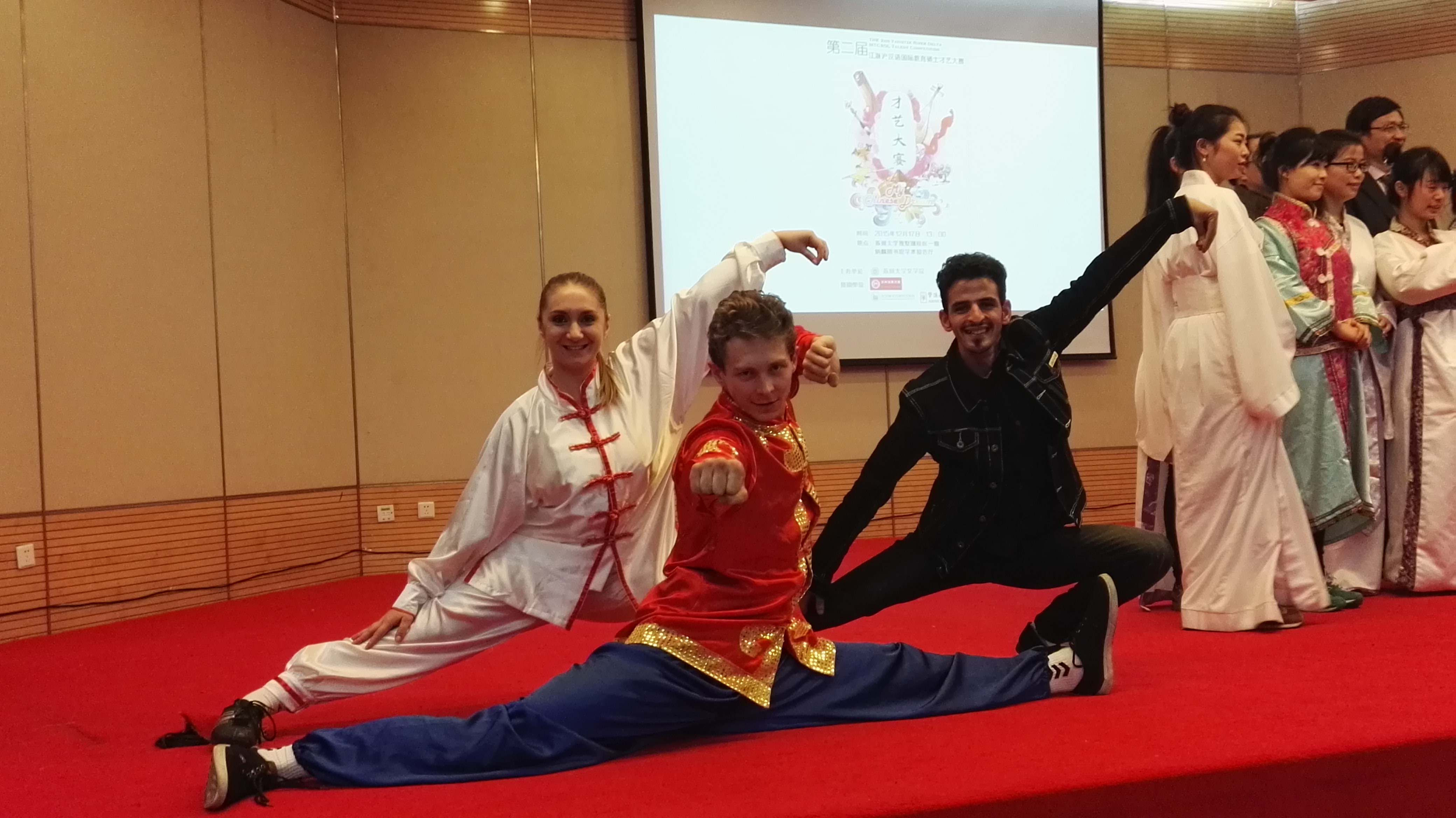 为了参加此次比赛,三位同学进行了精心准备和充分地练习。布柴伯同学还因此放弃了汉语课本学期周四的期末考试,选择下一个学期再拿该课学分。王博同学因为周三有课,乘坐深夜两点的火车连夜赶往苏州,凌晨近六点才到达苏州。莫丽丽同学还特地带上同屋的熨斗,在比赛前把表演服装熨好。莫丽丽同学的太极扇表演排在第二个,一出场便获得阵阵掌声,动作优美、姿态优雅,柔中带刚,刚中带柔。布柴伯的二十四式太极拳打得纯熟,非常地道,甚至胜过其他高校很多中国同学的太极拳表演。王博的中国武术表演排在倒数第二个,他一出场,便镇住了全场。王博的飞起踢腿、空翻、打旋等动作标准娴熟而利落,从长拳到醉拳…王博表演的这三分多钟牢牢抓住了全场所有观众的注意力。台上三分钟,台下十年功啊!由于表演场地有限,王博的很多需要助跑的动作施展不开,并没有达到他最好的水平。但是最后评分他获得了毫无疑问的第一名,荣获特等奖!