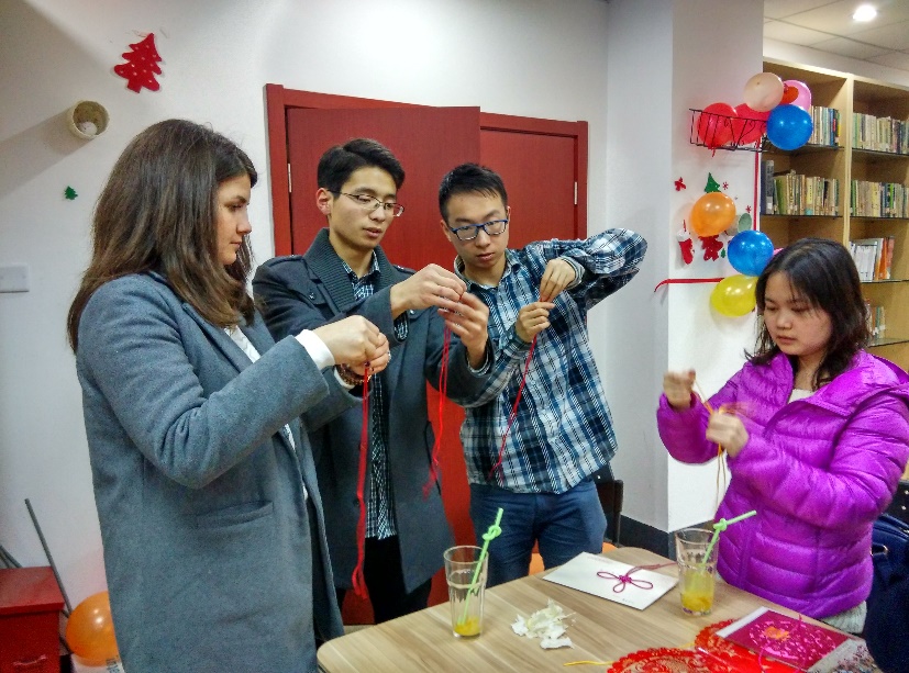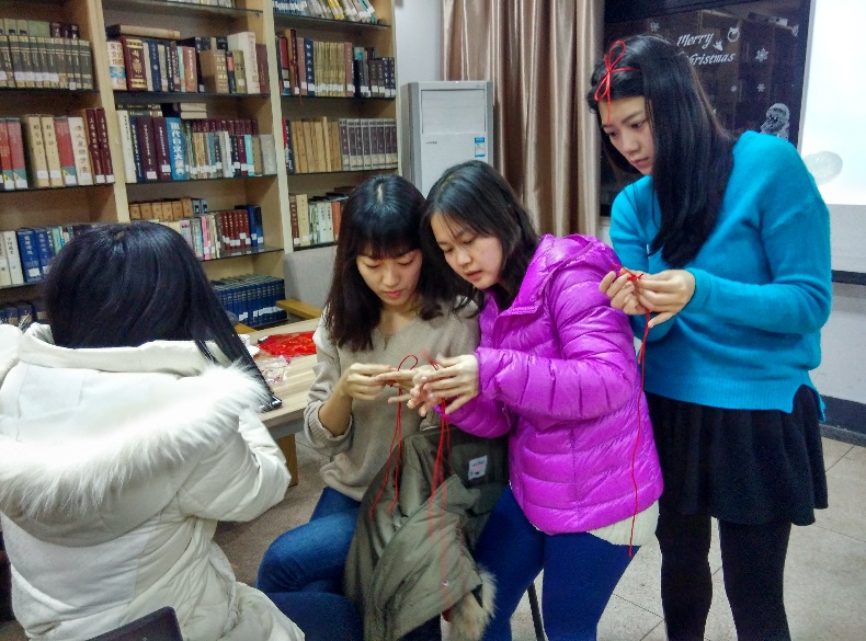 2016年1月5日星期二晚上,为了更深入的了解中国结文化,威廉希尔(WilliamHill-中文官方网站)国文系的语伴们在西溪校区主楼的鸽子屋特别举办了一次以“探秘中国结”为主题的年末聚会。