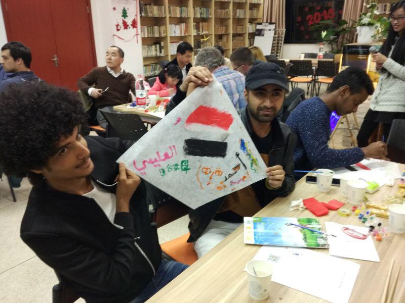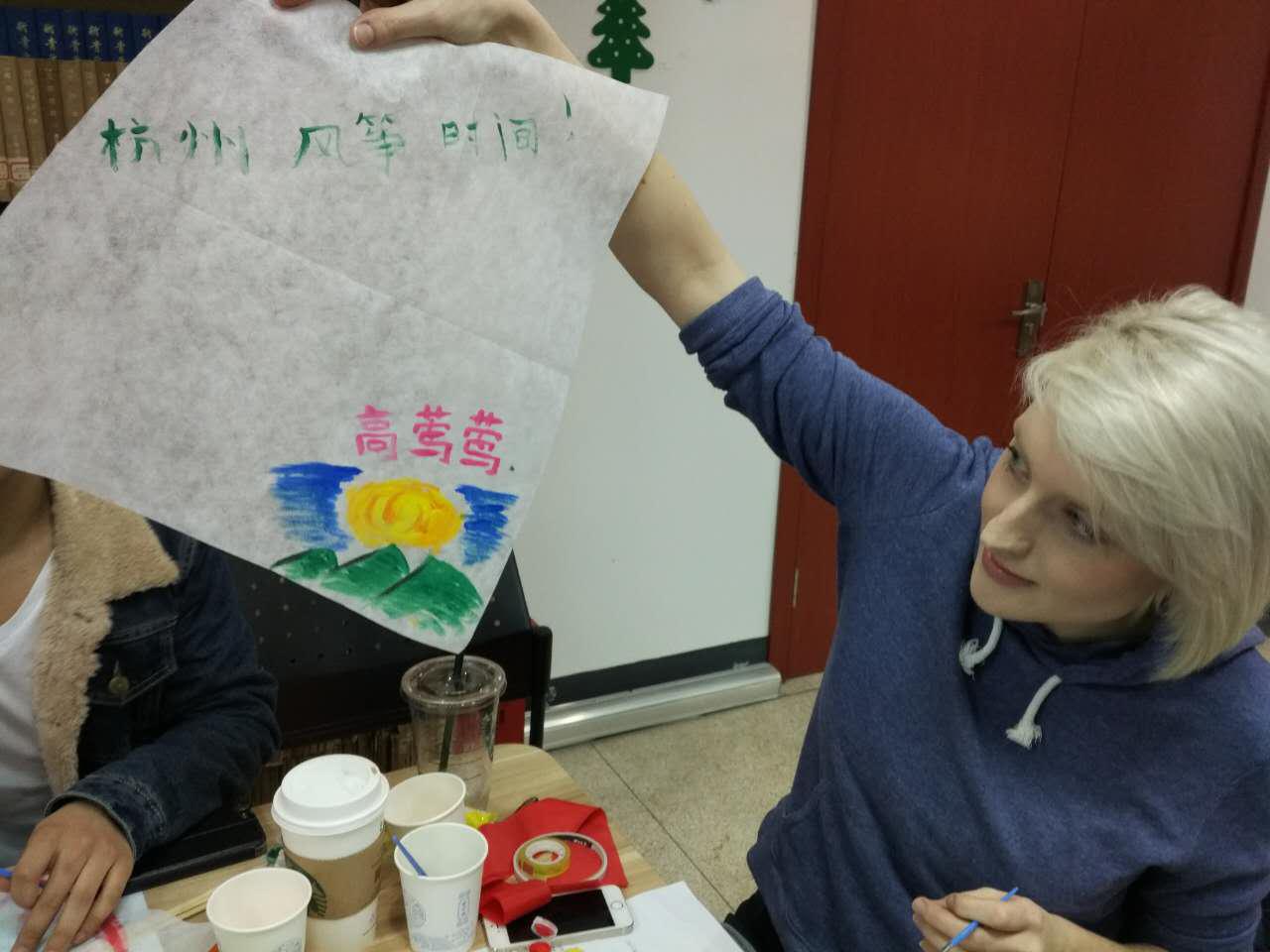 制作完成后,就到了展示的环节啦!来自不同国家的汉语学习者给我们展示了各种有意思的风筝。有人把他最爱的足球俱乐部的标志画上了风筝,有人做了只国旗风筝,还有人充分在风筝上展示了自己的绘画功力,在风筝上画了很多非常美丽的图案。