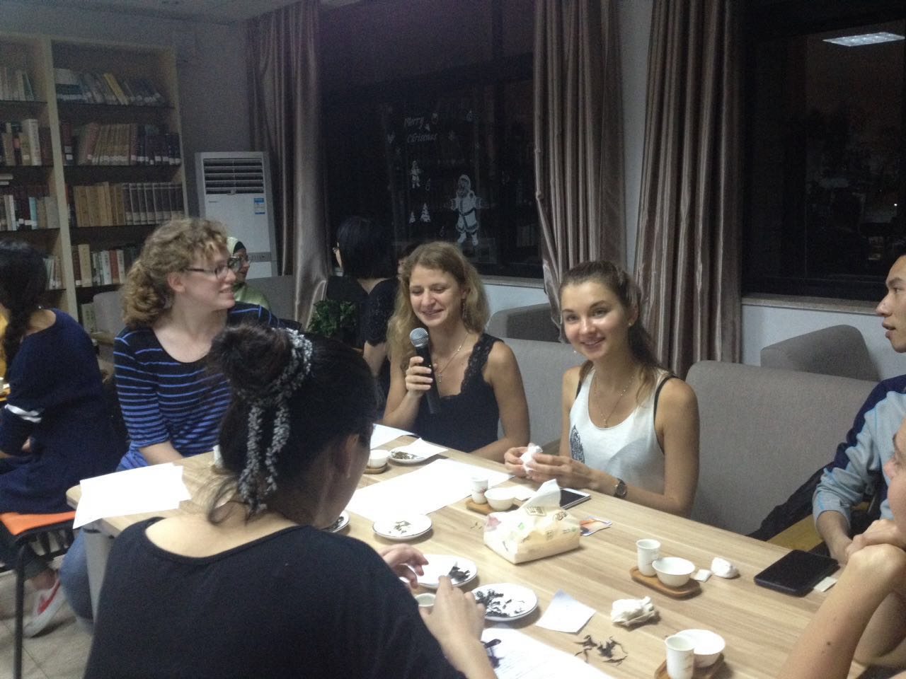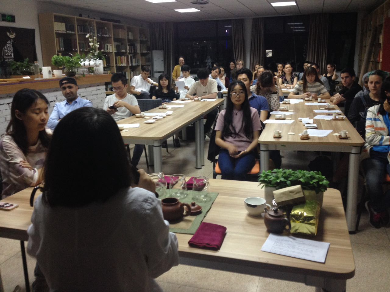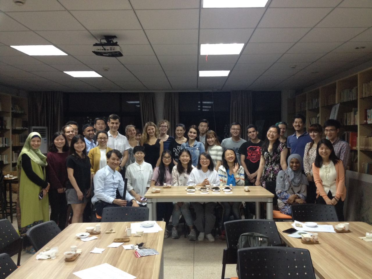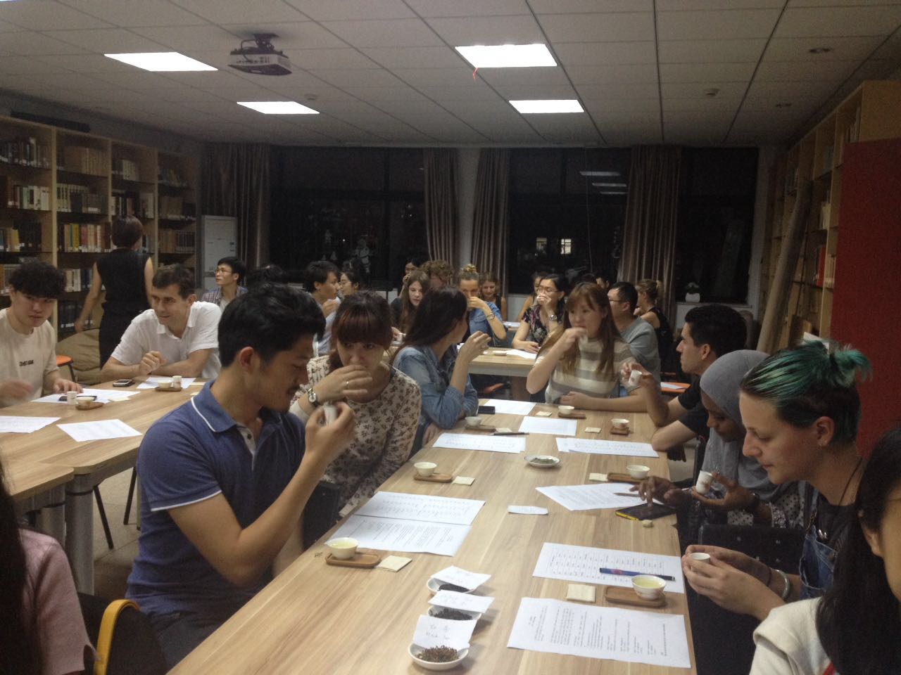 6月1日晚七点,浙大汉语角第21期又在传媒学院411鸽子屋准时拉开了帷幕。本期特别主题:茶——世界的语言,了解中国茶文化。此次将初中级和中高级两个汉语角合并,都在鸽子屋进行。喝茶,以茶待客是中国文化的传统。为了让外国朋友们更好地体验和了解中国茶,汉语角请来了浙大茶学系毕业的徐懿博士和大家交流茶和有关茶文化的各种知识。国际文化学系张丽萍老师和刘颖老师以及本科生科潘伊莎老师全程参与了这次活动。