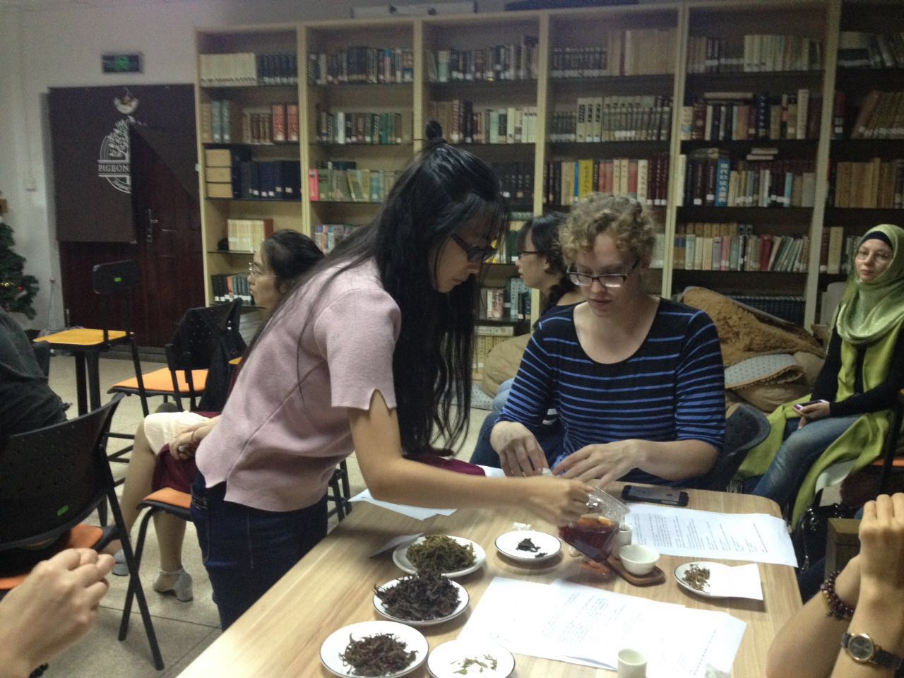 六点多,徐懿博士便和几位茶友到了现场,和组织的老师同学一起布置桌椅场地。为了让大家有更好的体验,徐博士除了带来好茶,烧水的专用茶壶,公道杯,还自己带来了四十多套茶具,包括闻香杯、品茗杯。几位茶友也帮忙一起摆放展示的茶叶,品茗的茶具,烧开水,等待我们的国际朋友们来临。七点,汉语角的新老朋友们陆续来到鸽子屋,一下子鸽子屋便成了一个国际家园。