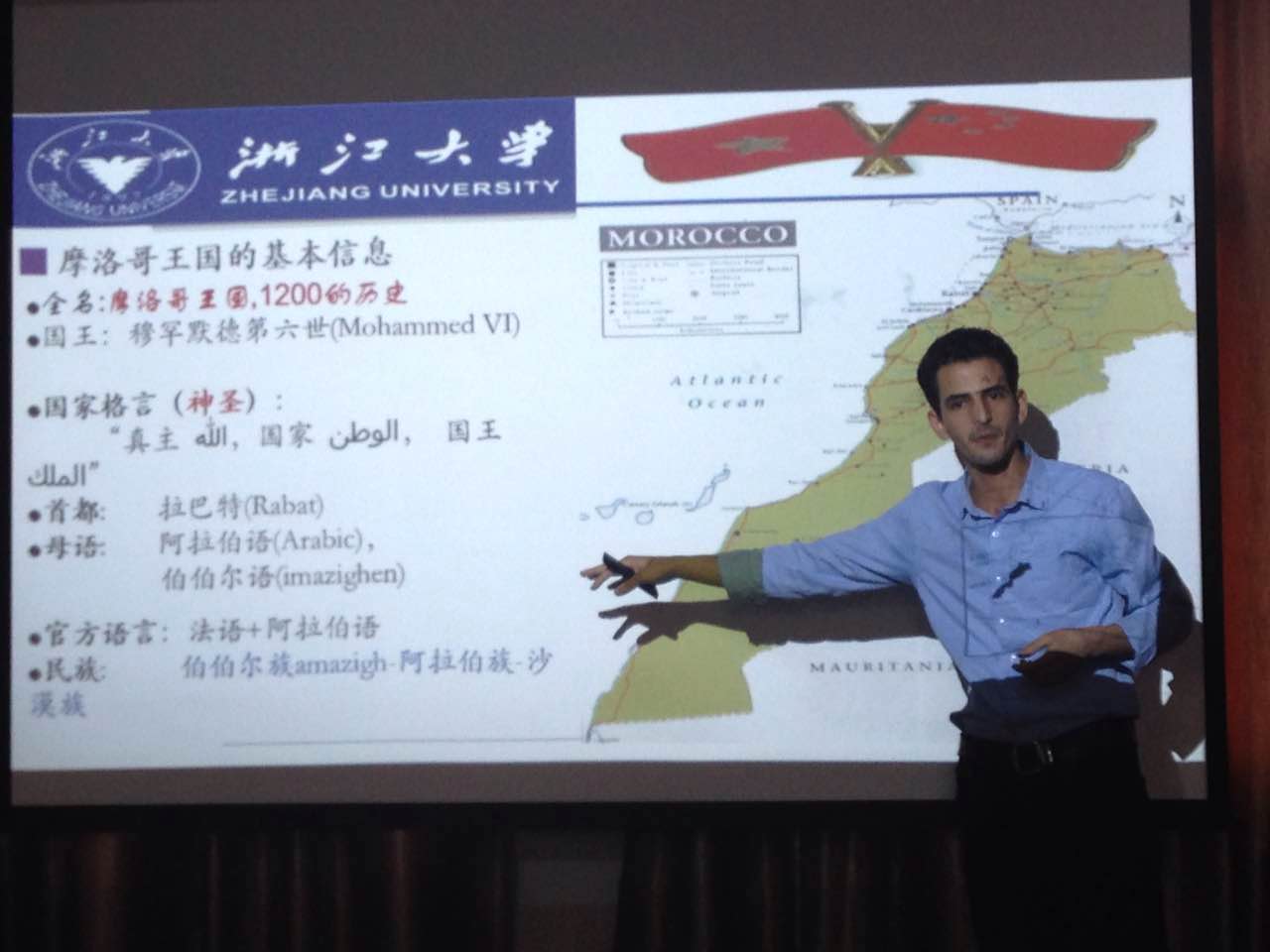 布柴伯准备充分,他的分享非常生动,从地理到历史,文化到音乐,还有名胜古迹与特产。摩洛哥位于北非,北边是直布罗陀海峡,靠近地中海。摩洛哥既有美丽的海岸线,又有神秘的撒哈拉沙漠,可以享受在海边骑骆驼的独特风光。摩洛哥王国已经有1200年的历史,既有原住民也有阿拉伯人,使用的官方语言也包括阿拉伯语与法语。布柴伯介绍了带有独特民族文化特色的打招呼的语言,既有法语也有阿拉伯语。