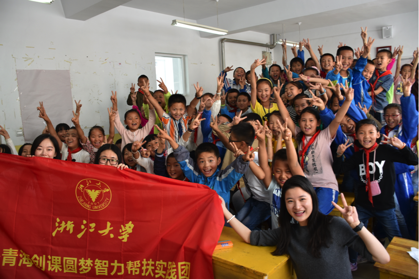 之后,跟随着亓力老师的节奏,孩子们的视线转移到了浙江省,转移到了杭州市,转移到了浙江大学。在青海省的此处此时,温暖地响起了“大不自多”的浙大校歌,不论是小朋友还是我们这群大朋友,都看着MV里的场景切换,兀自体会着属求是、属创新的浙大人文精神。