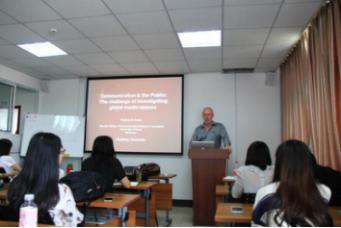 讲座开始前,新闻所所长韦路教授简单介绍了本次传播大讲堂的主讲人Stephen Reese教授。在在座师生的热烈掌声中,Stephen Reese教授走上讲台,正式开始了本次的传播大讲堂。