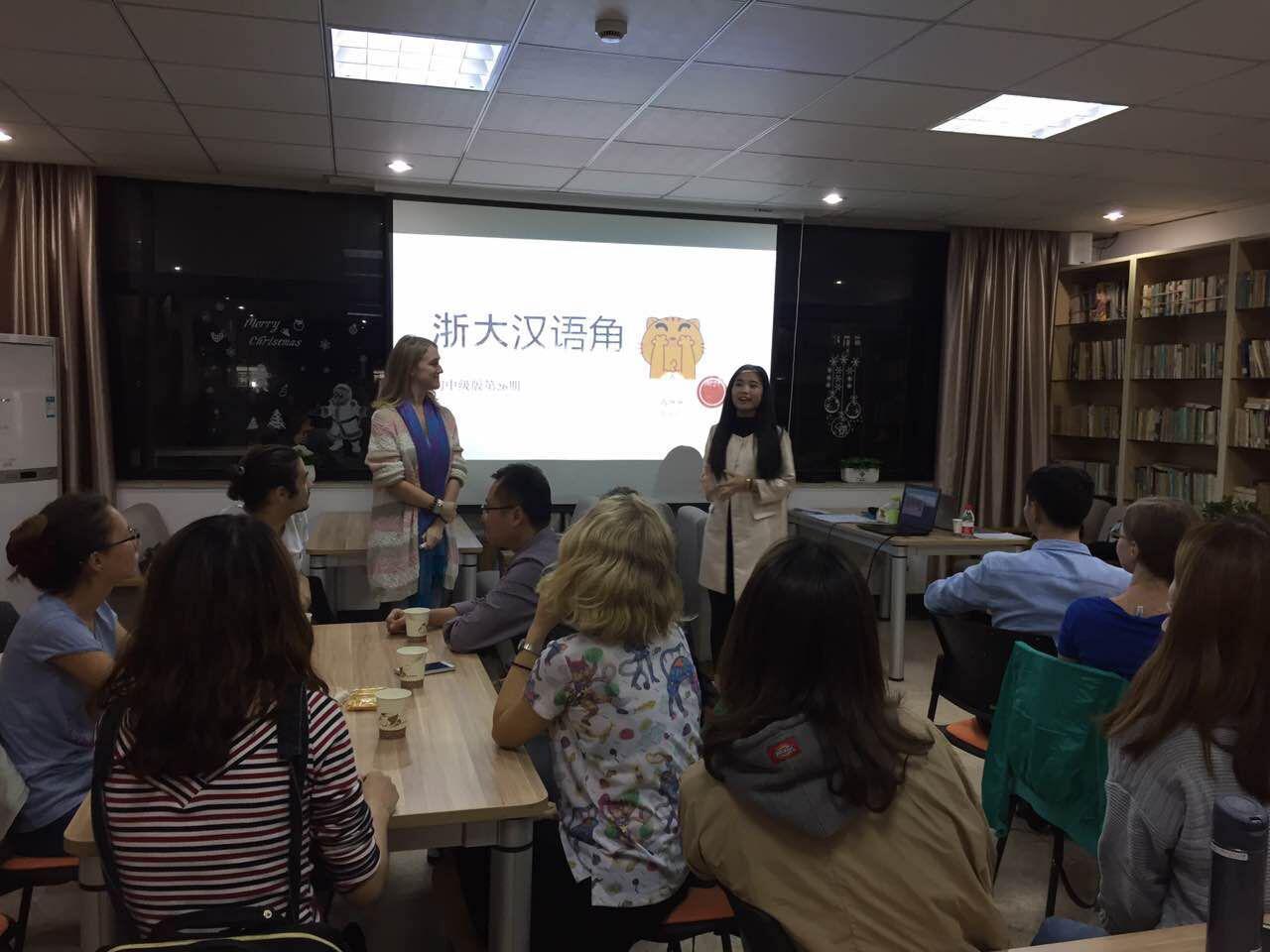 10月26日晚上7点,浙江大学第二期初中级汉语角在汉语教育硕士研究生夏荷蓓(荷兰)和陶琳琳的主持下在传媒学院鸽子屋顺利进行。虽然天空不作美,但是住在紫金港和玉泉校区的留学生们纷纷冒雨赶来参加我们的汉语角,为我们的活动增色不少。