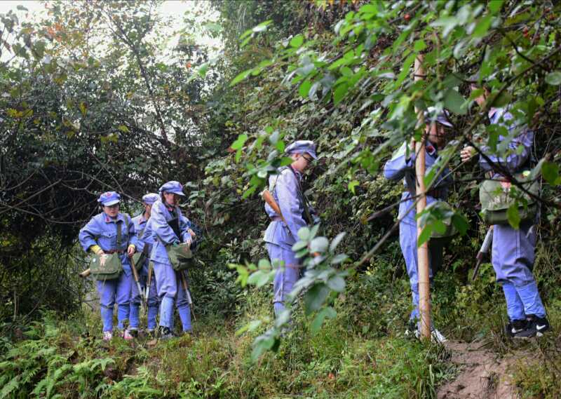 第二天的培训主题是体验“红军的一天”。党员们穿着红军装,带着枪和担架,重走急行军战士走过的路。这一天早晨刚下过雨,山区的地面更加湿滑。党员们不仅要徒步走完4公里的山路,还要完成辨识草药、寻找地标等任务。一路上,各位党员们互相帮助,团结协作,发挥出党员的带头作用和吃苦耐劳的精神品质。虽然路途艰辛,但顺利到达了终点并且完满地完成了任务。