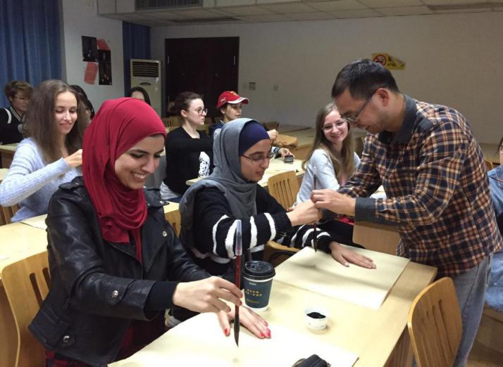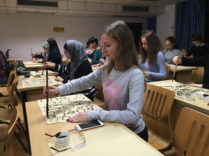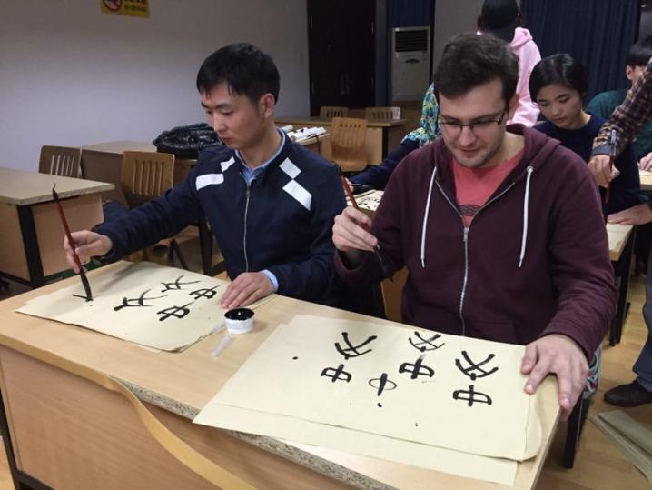 秋意正浓的11月,由浙江大学威廉希尔(WilliamHill-中文官方网站)“汉语之声”主办、2016级汉语国际教育专业师生承办的首期中国书法体验活动于2016年11月4日晚上在西溪校区教学主楼426教室开展。本次活动请来了浙大城市学院江根源博士前来主讲,本着“愿以点滴墨水,滋润新生心灵”的主题普及汉字书法书写艺术,提升中外学生对书法艺术的兴趣,感受汉字文化的博大精深。