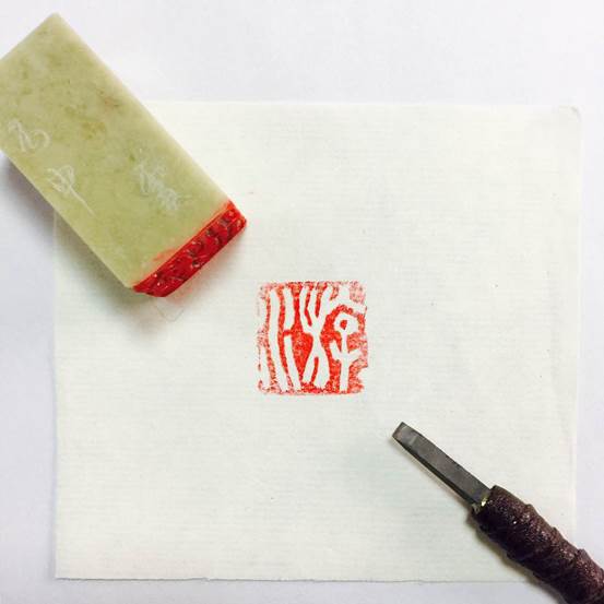课堂体验活动开始时,徐老师简单介绍了篆刻艺术的起源,从“印宗秦汉”降到了赵孟頫的印章变法,篆刻艺术逐渐与书写性艺术融合到一起;最后介绍了西泠印社社长吴昌硕大刀阔斧将强烈的写意性融入到篆刻当中。紧接着徐老师详细介绍了篆刻的操作方法,本次主要是临摹字体进行阴文篆刻。首先拿到印石后,用“8”字法打磨印石,这种方法使印石各个面都比较均匀;其次,用拷贝纸覆盖于需要篆刻的文字之上并用毛笔进行临摹,描黑色部分。最后将拷贝纸覆于印石之上,用水沾湿拷贝纸,使墨显于印石之上,最后便是拿起刻刀篆刻。在认真仔细地完成准备工作后,同学们跃跃欲试,拿起手中的刻刀,小心翼翼又聚精会神地雕刻自己的作品。在此期间,老师不断对学生进行指导,并提醒学生用无名指抵住印石,小幅度小范围地进行刻画,这样能够避免对手造成伤害。同学们一个个屏气凝神,用心经营着自己的方寸世界,午后阳光正好,时间一寸寸流逝,同学们手中的方寸世界也逐渐清晰,向大家展示着独特的魅力。