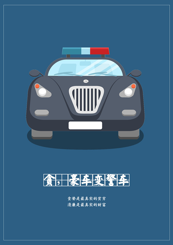 第一幅作品《贪,豪车变警车》,在奔驰车顶加上象征警车的警灯,寓意贪腐逃脱不了警方的制裁;