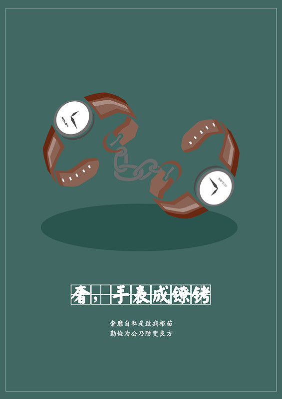 第三幅作品《奢,手表成镣铐》,把两个名贵的劳力士手表用铁链连接成手铐的形状,也体现了贪腐之人终将难逃法网。