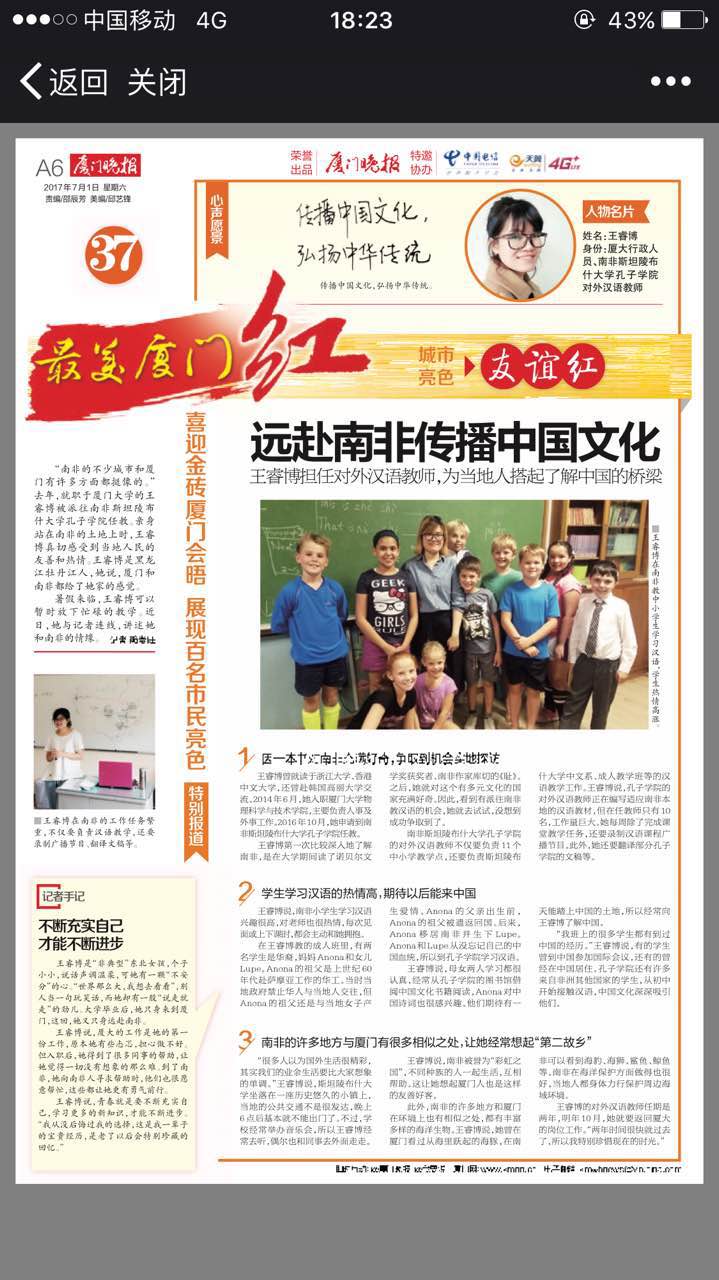 王睿博同学将自己对中国文化的热爱与理解,全心投入到南非的中国语言文化传播工作中,架起中非友谊的桥梁,用自己的行动书写灿烂的青春与人生。