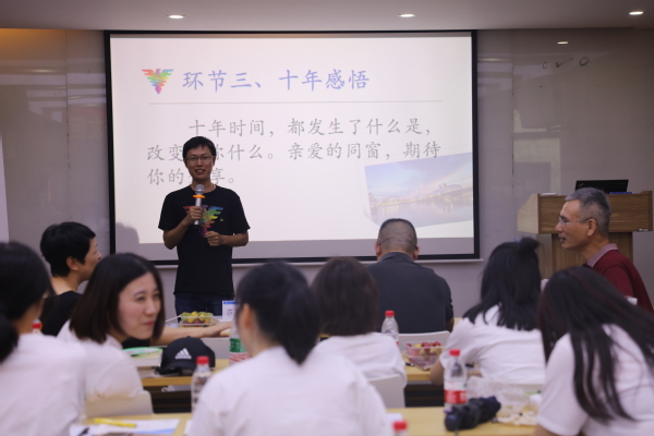 随后,同学们陆续上台。分享毕业十载的工作经历和收获。毕业之后,他们有的在各个岗位间辗转,最终明确自己的目标;有的工作稳定,家庭幸福美满,并收获双胞胎宝宝;有的事业顺利,已打拼出属于自己的公司,虽有不同的经历与生活,但大家同样都感恩母校的教导,以母校为荣。在主持人的提议下,大家纷纷拿笔在信纸上写下对十年后自己的话,制成“时间胶囊”封存,等待下一个十年的到来。