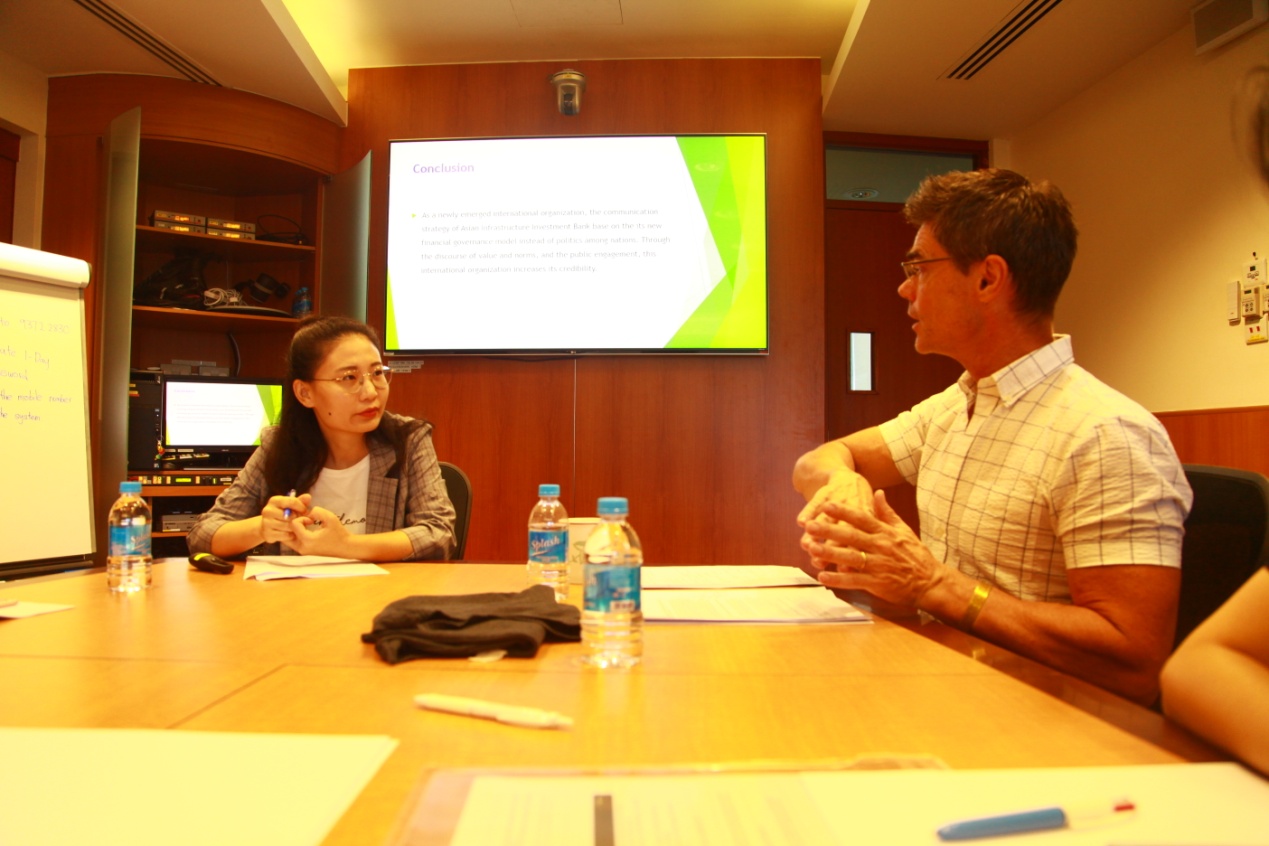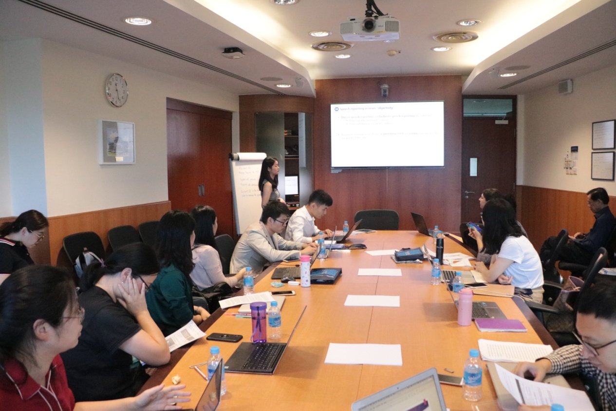 前两场报告会中,浙大博士生于汐报告了新加坡华语电视剧在讲述历史的过程中,如何构建新加坡人的身份认同;梅朝阳探讨了外媒对中国梦的新闻报道中话语建构的策略;郑红红在客观反映论、意向论、构成论的三种立场下,探讨了纪录片真实性的问题; NTU博士生段旭报告了短视频博主和粉丝之间亲密互动关系的质性研究;Clare报告了本地离散人群社交媒体的使用与集体认同建构的研究。南洋理工大学的汪炳华(ANG Peng Hwa)教授,和浙大的李思悦老师针对同学们报告的论文进行了精彩的点评并与同学们展开了深入的学术讨论。