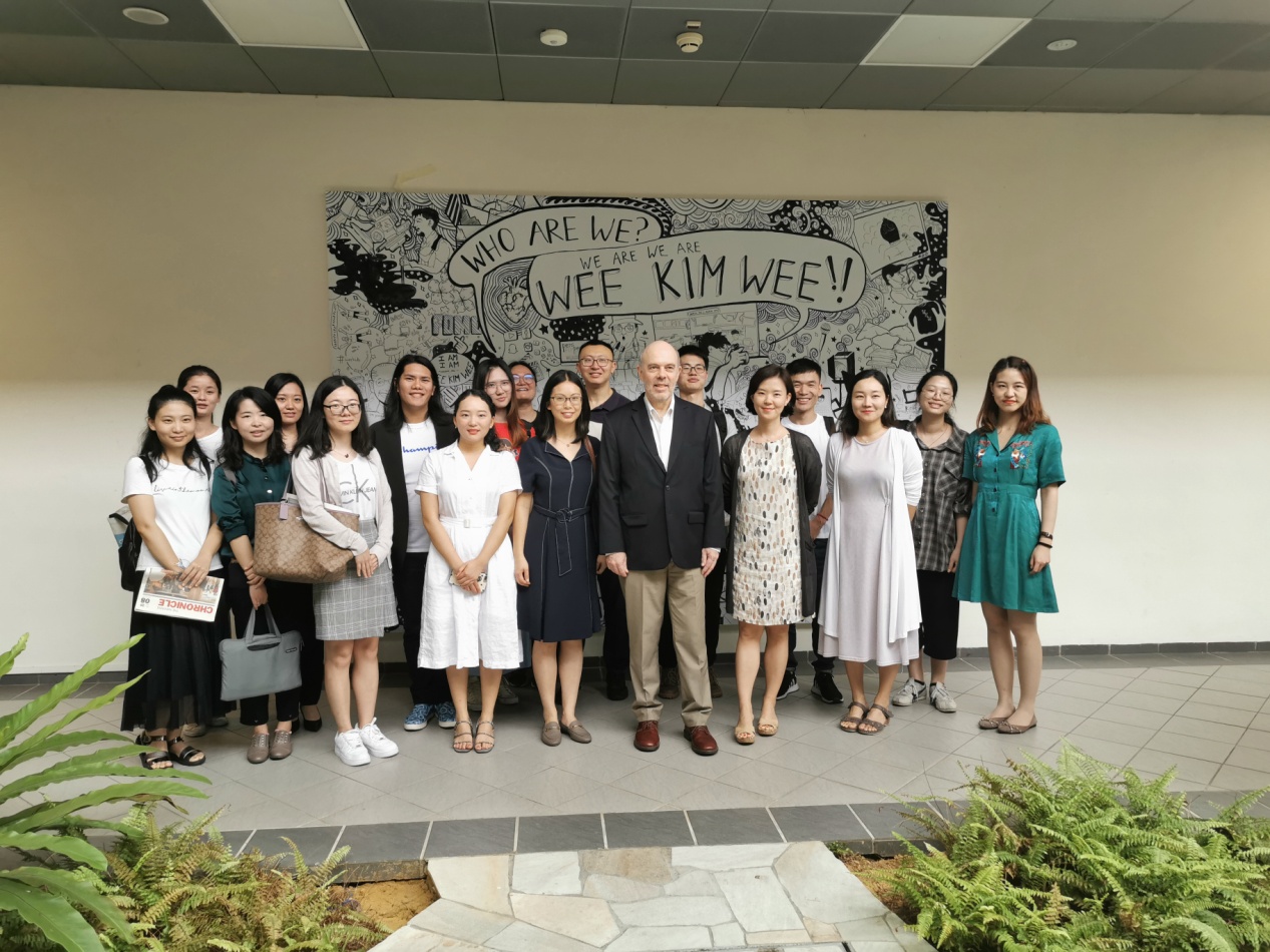 (新加坡南洋理工大学黄金辉传播与信息学院院长Charles T. Salmon教授及学院教师与浙大师生在文化墙前合影)