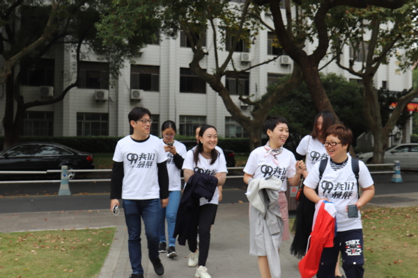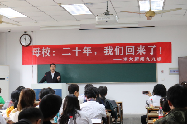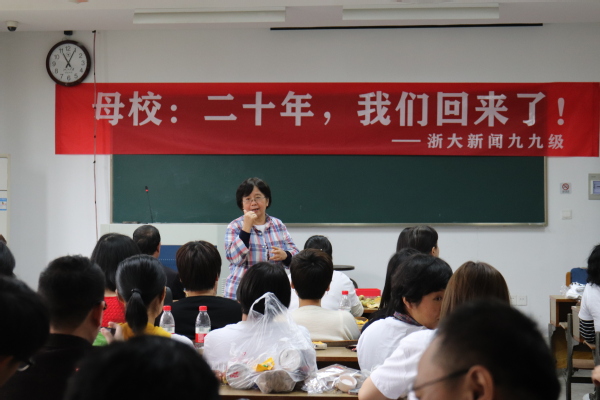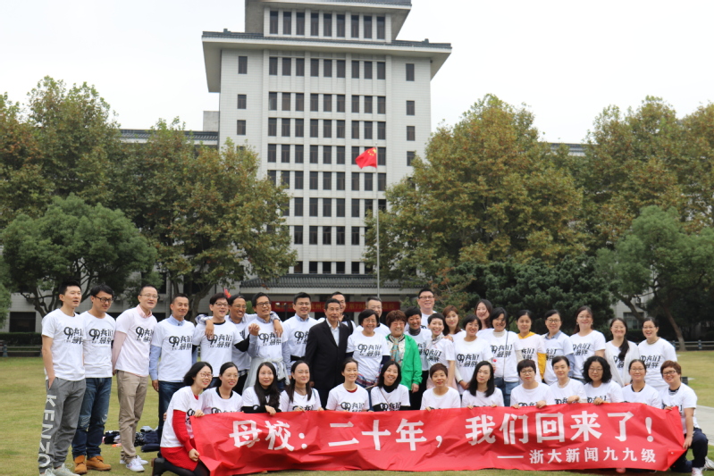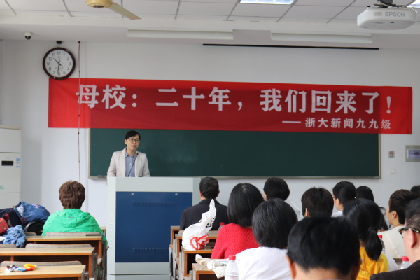 ”春天的花开秋天的风以及冬天的落阳,忧郁的青春年少的我曾经无知的这么想……”一首光阴的故事勾起了多少人的回忆,也把九九级新闻班的同学们带回到了他们最美好的大学时光。2019年10月26日,九九级新闻班的同学们重回浙江大学西溪校区,20年前他们踏上这边土地开始求学求知的大学时光,20年后,他们重回故土回首曾经的青葱岁月,分享毕业后的酸甜苦辣。早上10点不到,西溪校区田家炳楼204号教室已经坐满身着班服的同学们,教室里充满了欢声笑语,同学们特地邀请了易容老师、张梦新老师、张英华老师。