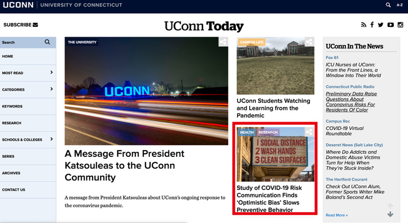 近日,威廉希尔(WilliamHill-中文官方网站)陈宏亮老师与著名传播学者David Atkin教授合作撰写的文章Study of COVID-19 Risk Communication Finds ‘Optimistic Bias’ Slows Preventive Behavior (《新冠疫情风险传播研究:“乐观偏见”与预防行为》)登上UConn Today网站首页(2020.4.8)。